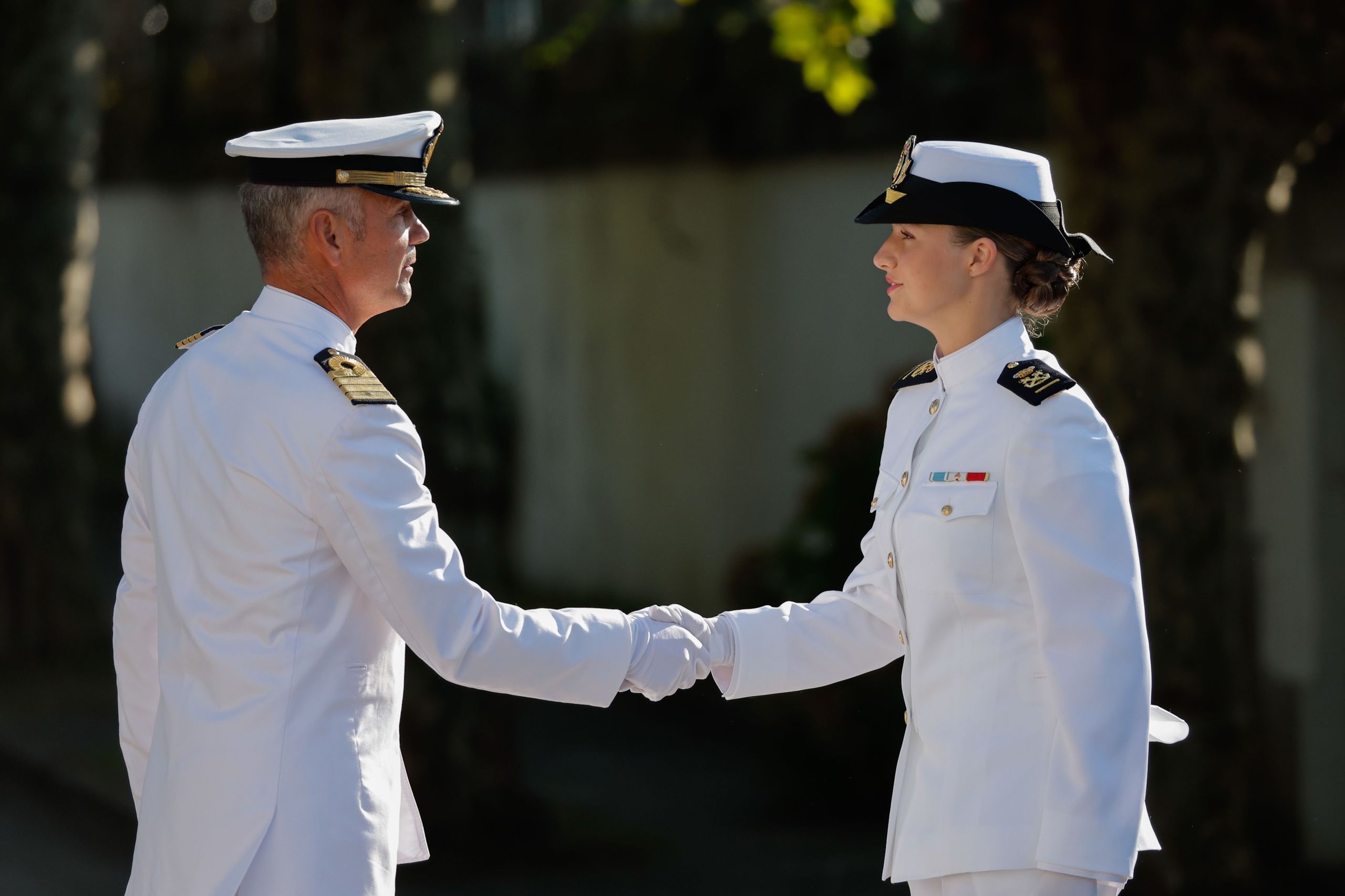 La Princesa de Asturias comienza en el tercer curso de la academia, con el rango de Guardiamarina de Primera. Así queda reflejado en el uniforme con el que ha acudido su primer día al centro.