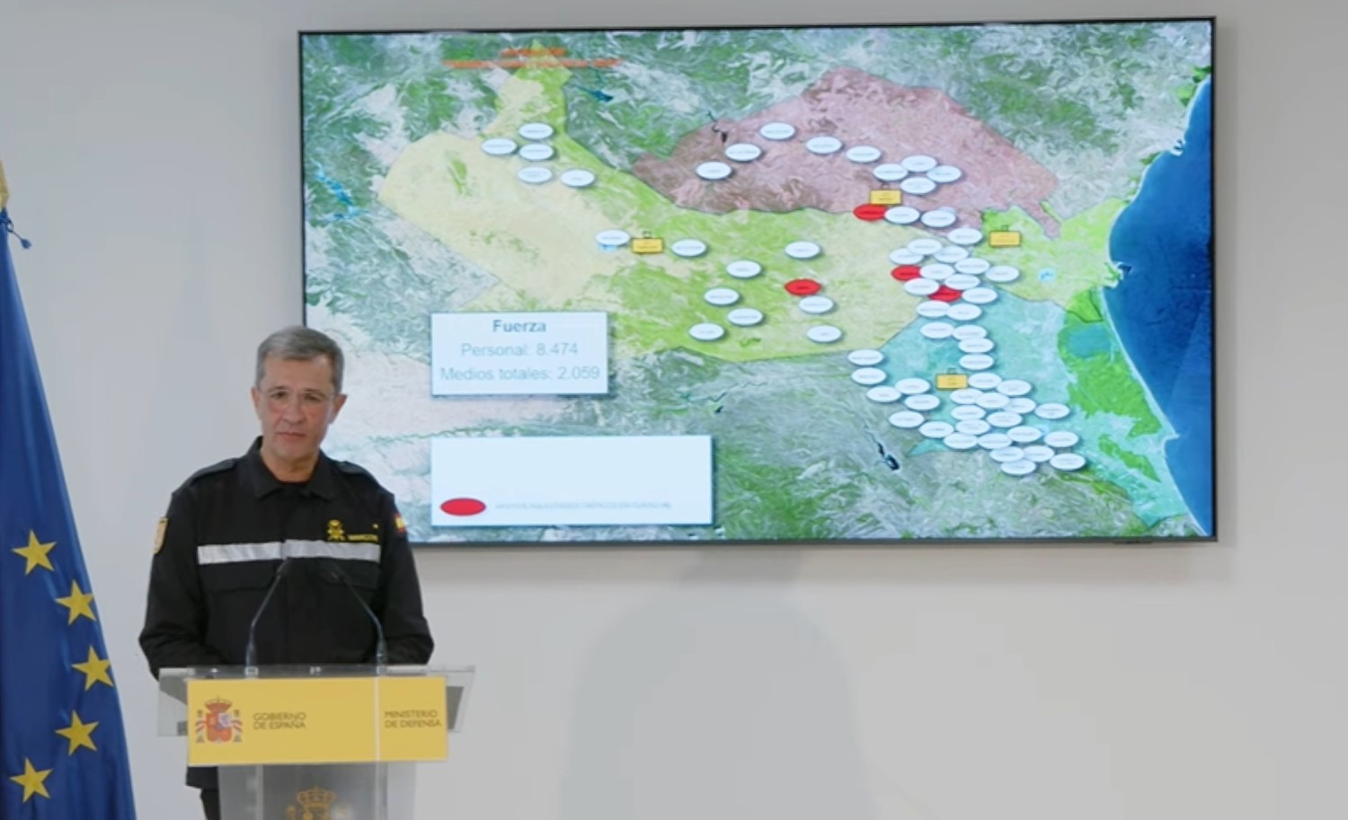"Sabemos que son localidades especialmente preocupantes, pero sin dejar de trabajar en las localidades que están en blanco, amarillo y verde", ha mantenido el alto mando militar, que ha explicado que la Unidad Militar de Emergencias, el Ejército de Tierra, la Armada, el Ejército del Aire y el Espacio y la Guardia Real se encuentran realizando o han llevado a cabo diferentes labores de apoyo en un total de 72 municipios valencianos.