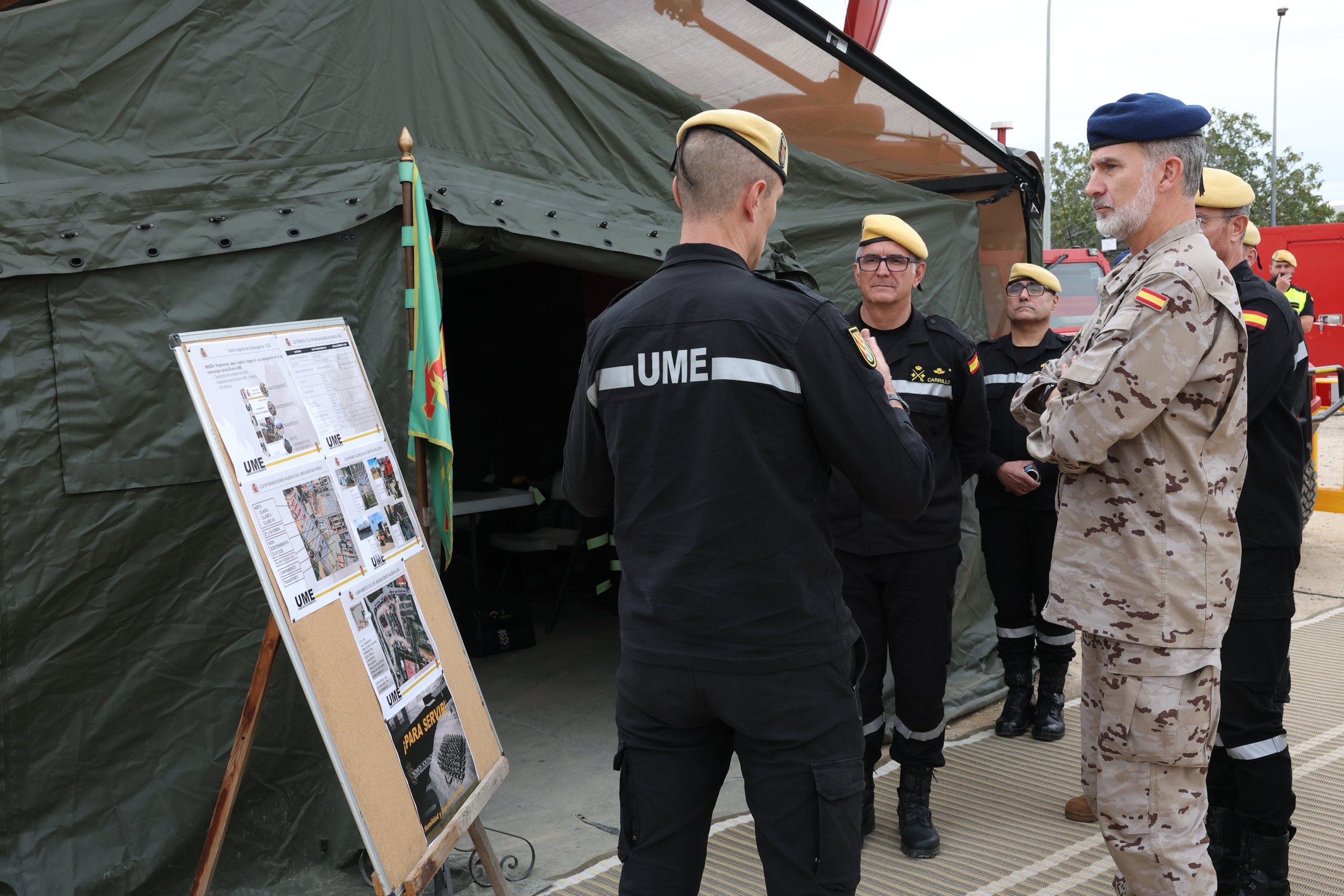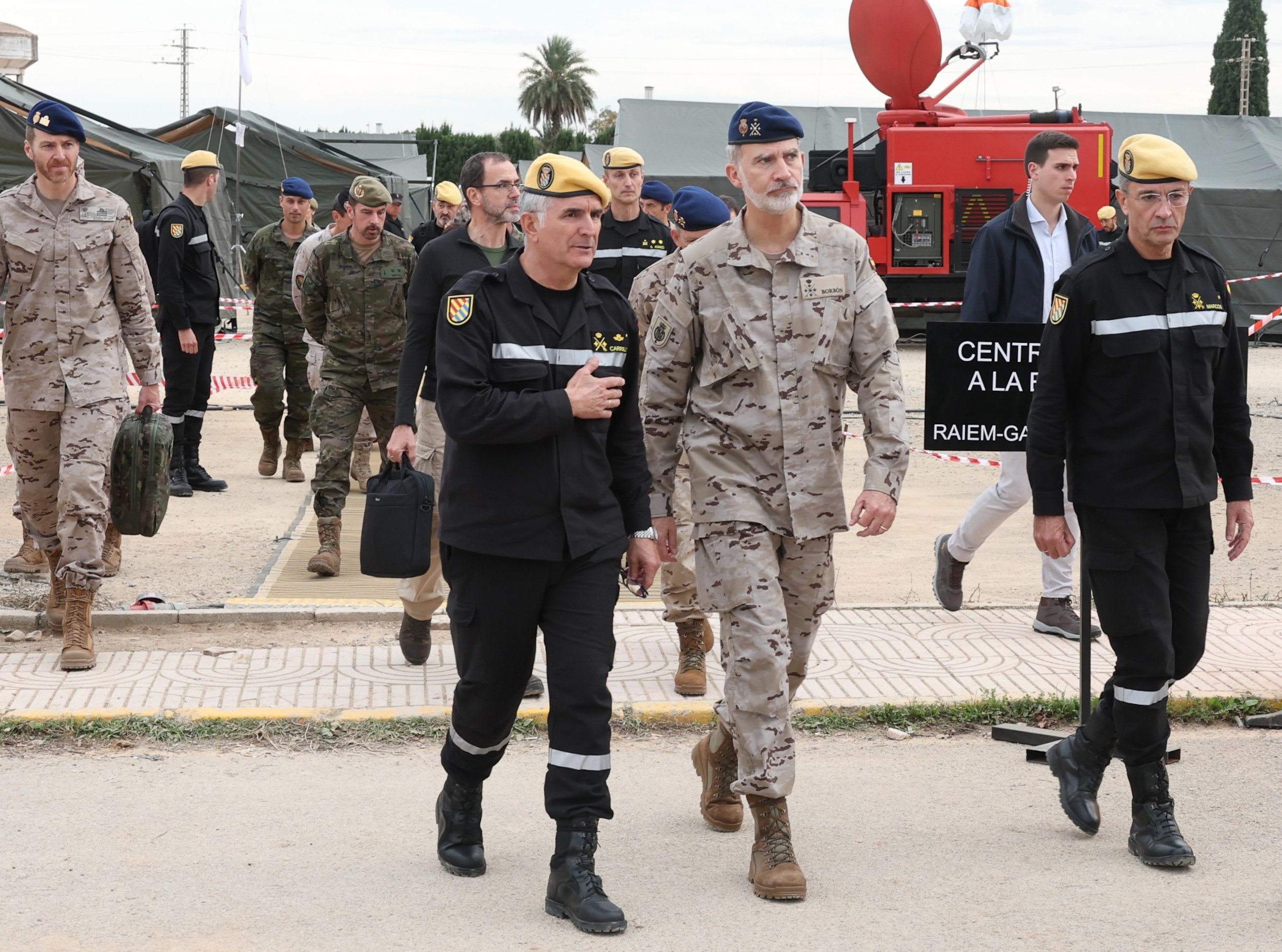 El rey Felipe VI ha visitado este martes las instalaciones militares donde se encuentran los efectivos de las Fuerzas Armadas desplegados en Valencia para apoyar por los destrozos de la DANA,