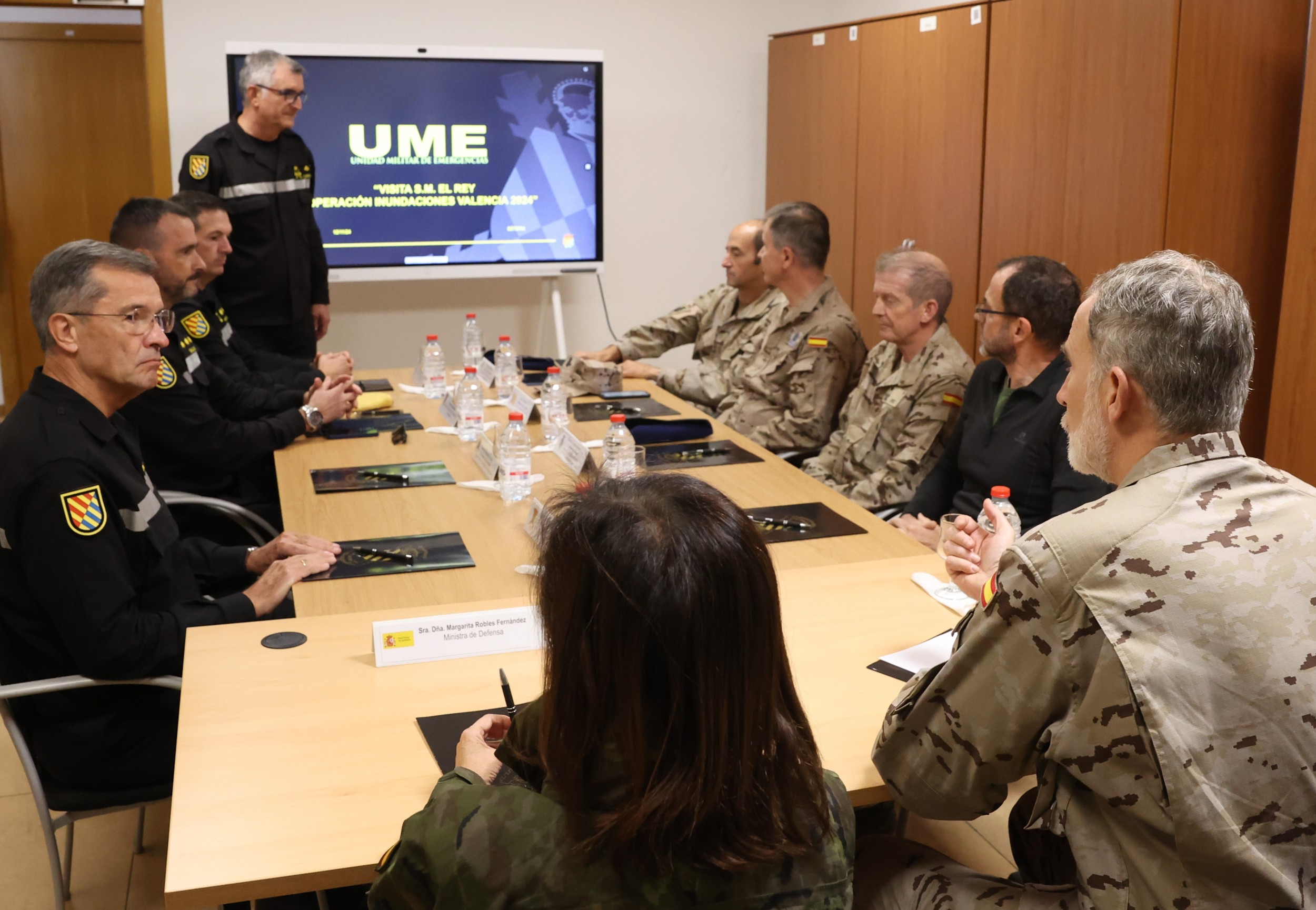 El Rey ha recibido un pequeño briefing sobre las misiones que en estos momentos tienen abiertas los militares que trabajan para apoyar el regreso a la normalidad de la provincia de Valencia.