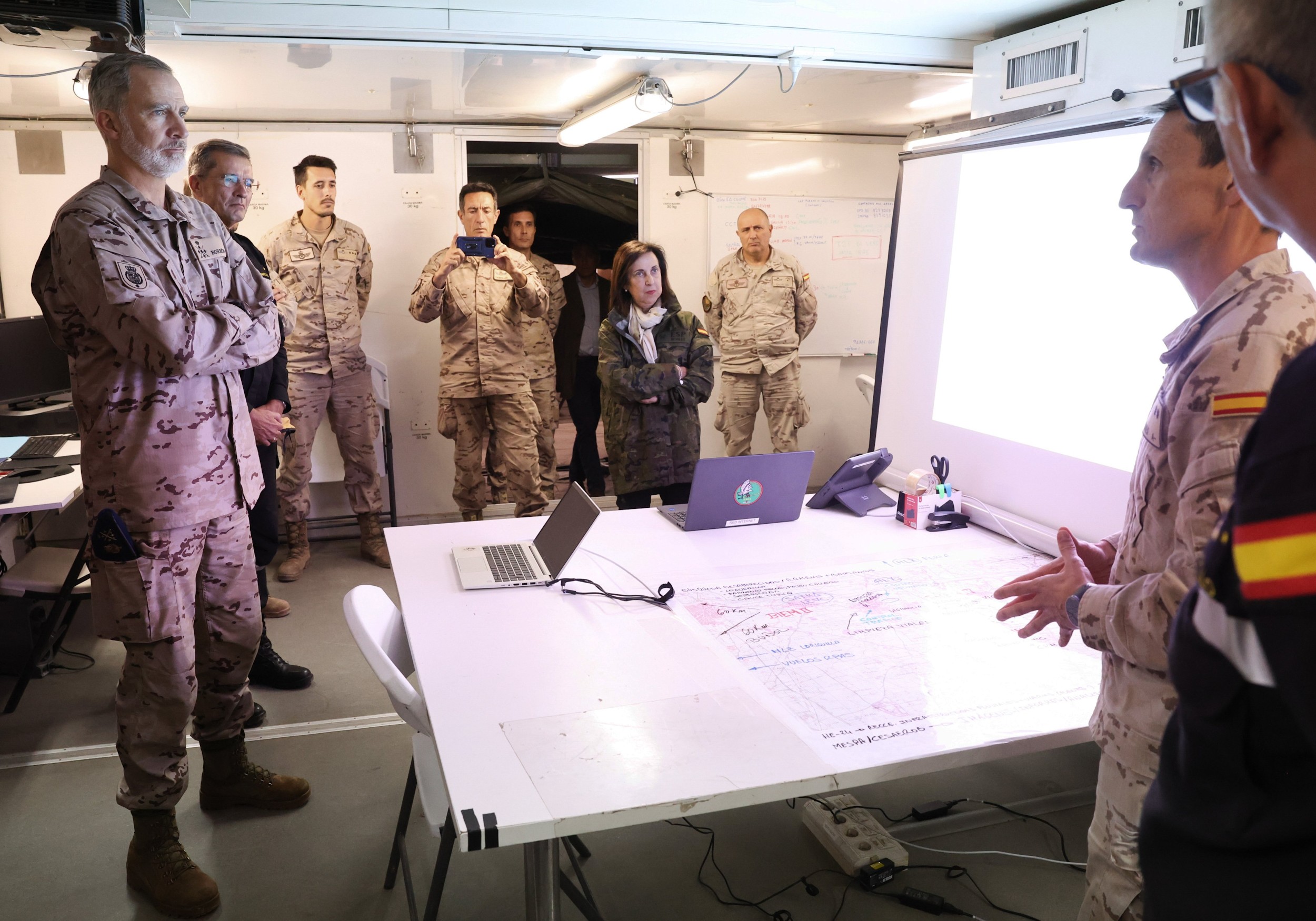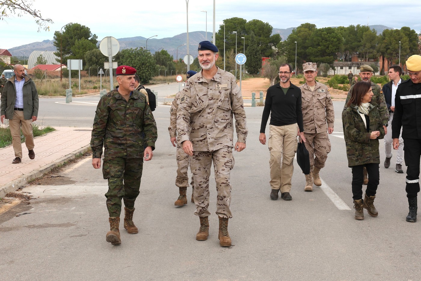 Felipe VI, acompañado por la ministra de Defensa, ha visitado este martes las instalaciones militares donde se encuentran los militares desplegados en Valencia.