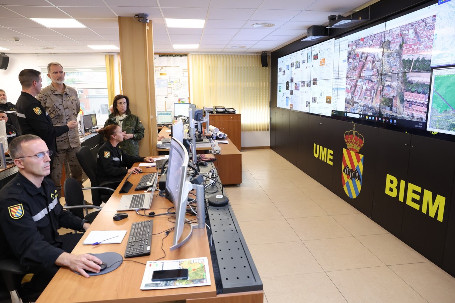 Listo para comenzar la visita, junto a la ministra de Defensa, Margarita Robles, se ha dirigido al puesto de mando de la Unidad Militar de Emergencias (UME), que se encuentra en estas instalaciones.