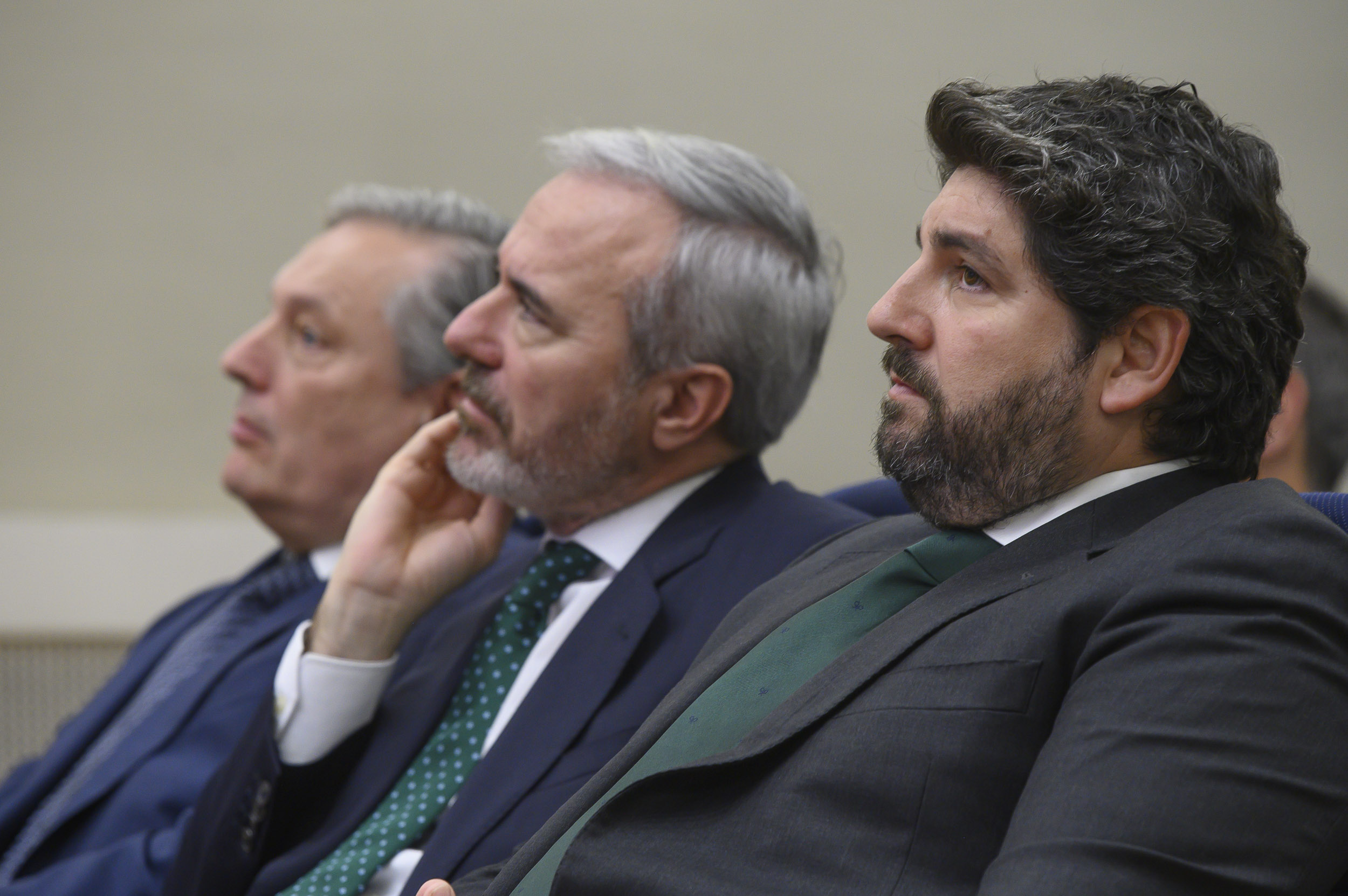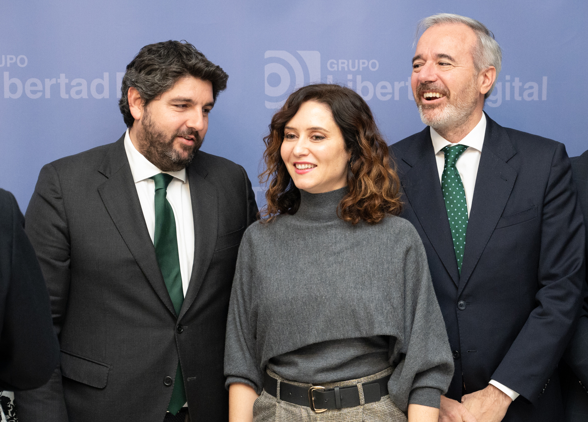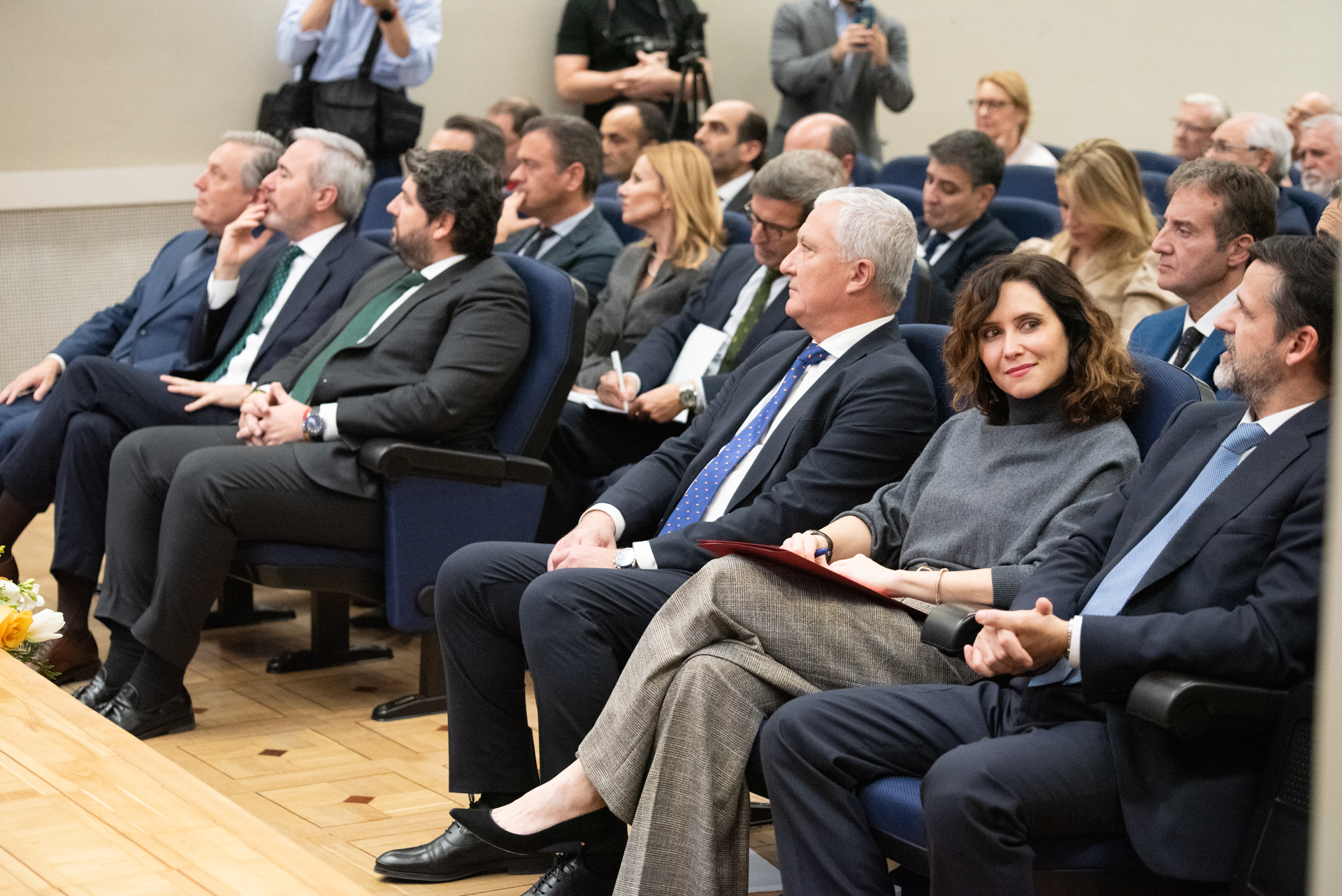 Fernando López Miras y Jorge Azcón siguen atentamente la intervención de Díaz Ayuso.