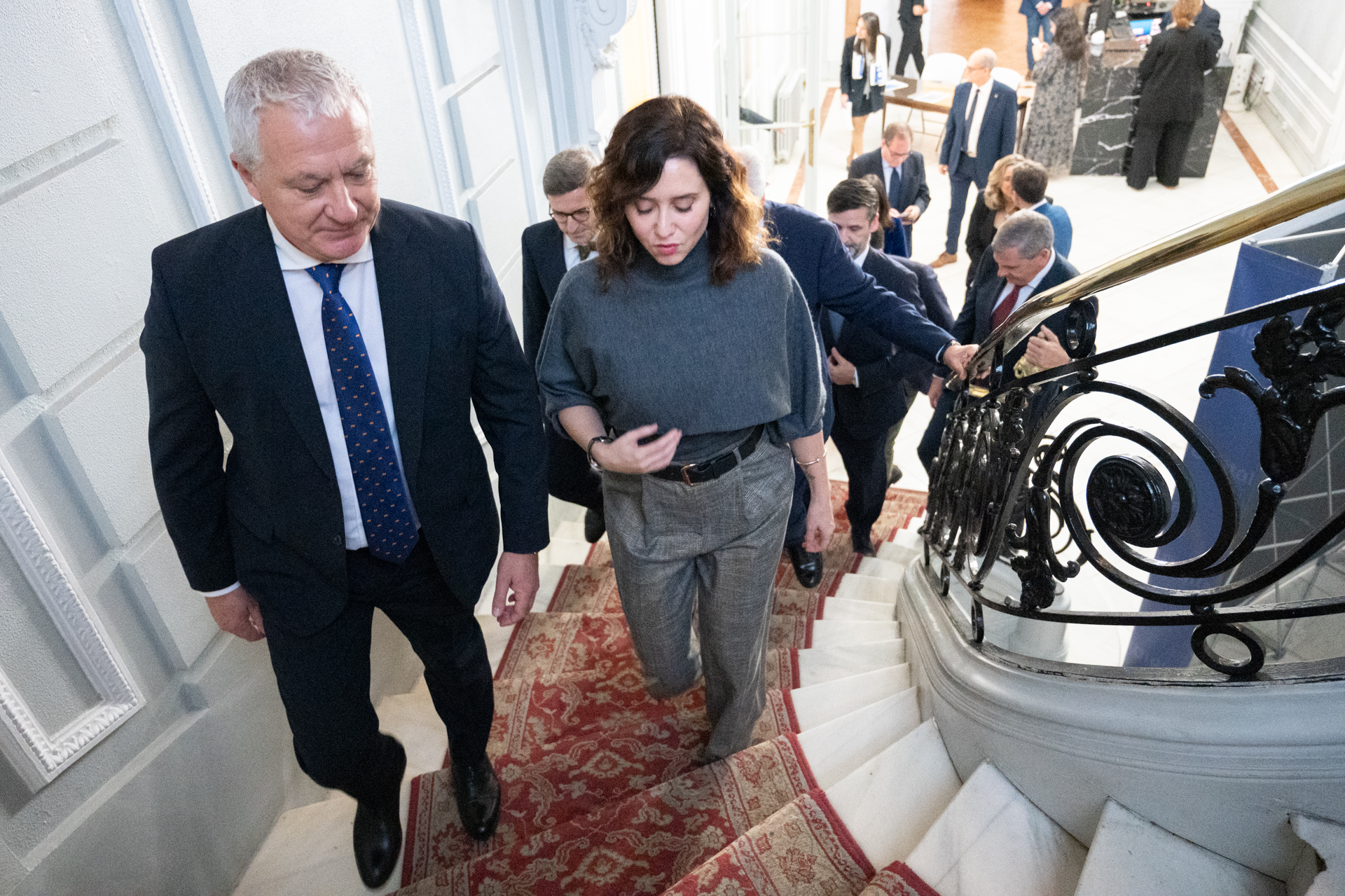 La presidenta de la Comunidad de Madrid conversa con alguno de los presentes antes de empezar el foro Liberdefensa.