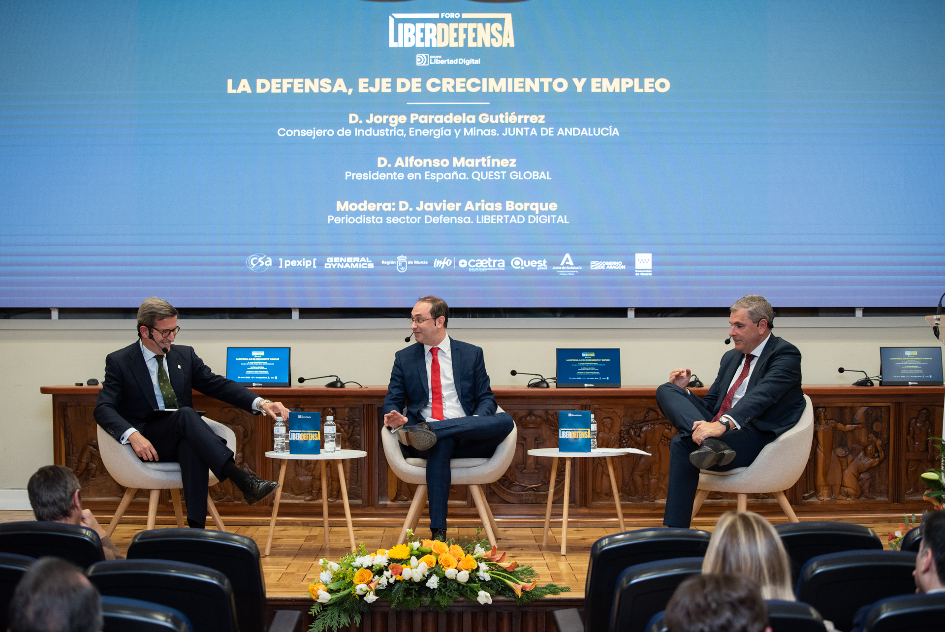 Jorge Paradela Gutiérrez, consejero de Industria, Energía y Minas de la Junta de Andalucía, Javier Arias Borque de Libertad Digital y Alfonso Martínez, de Quest Global, en una de las mesas redondas del evento.