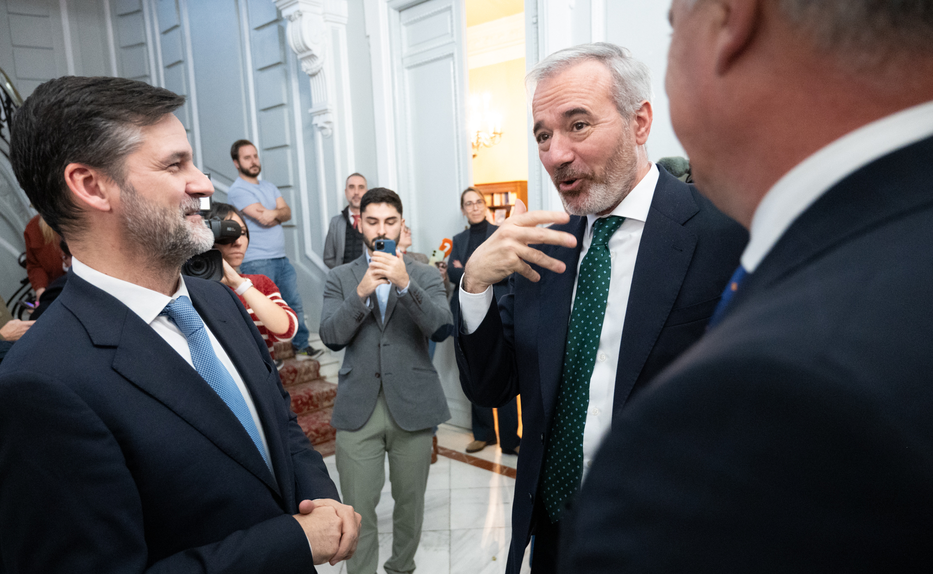 Javier Somalo conversa con el presidente de Aragón, Jorge Azcón.