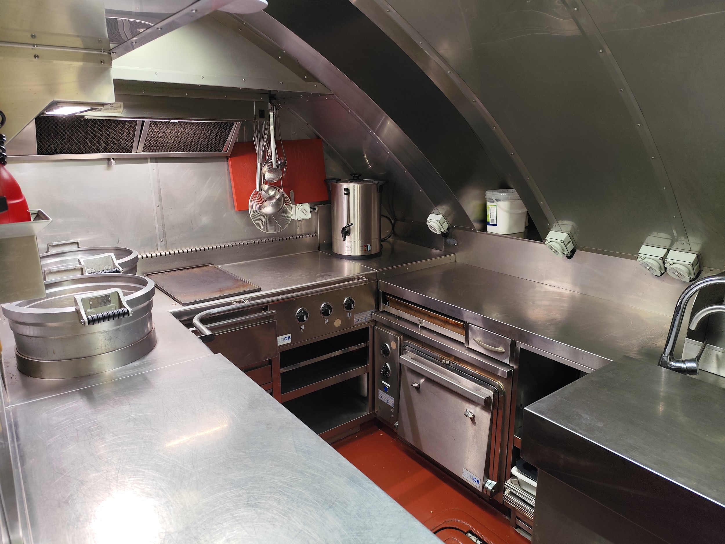El interior es tan justo y apretado que parte de los utensilios de la cocina están en el pasillo principal del submarino.
