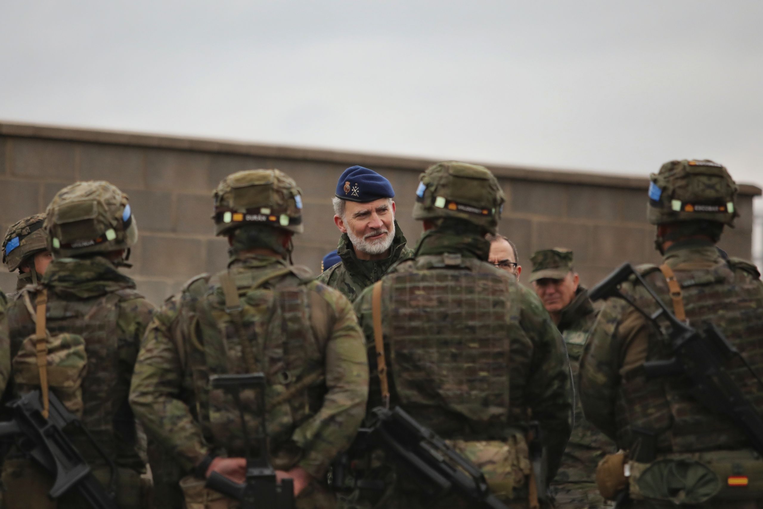 En concreto, el moncarca ha visitado este miércoles la Unidad de Formación de Combate de Personal Ucraniano del centro de formación militar del Ejército de Tierra toledano, donde ha presenciando ejercicios tácticos de combate en zona urbanizada, de asalto a posición defensiva y de tiro con fuego real. Todo ello en el marco del tercer año del estallido del conflicto.