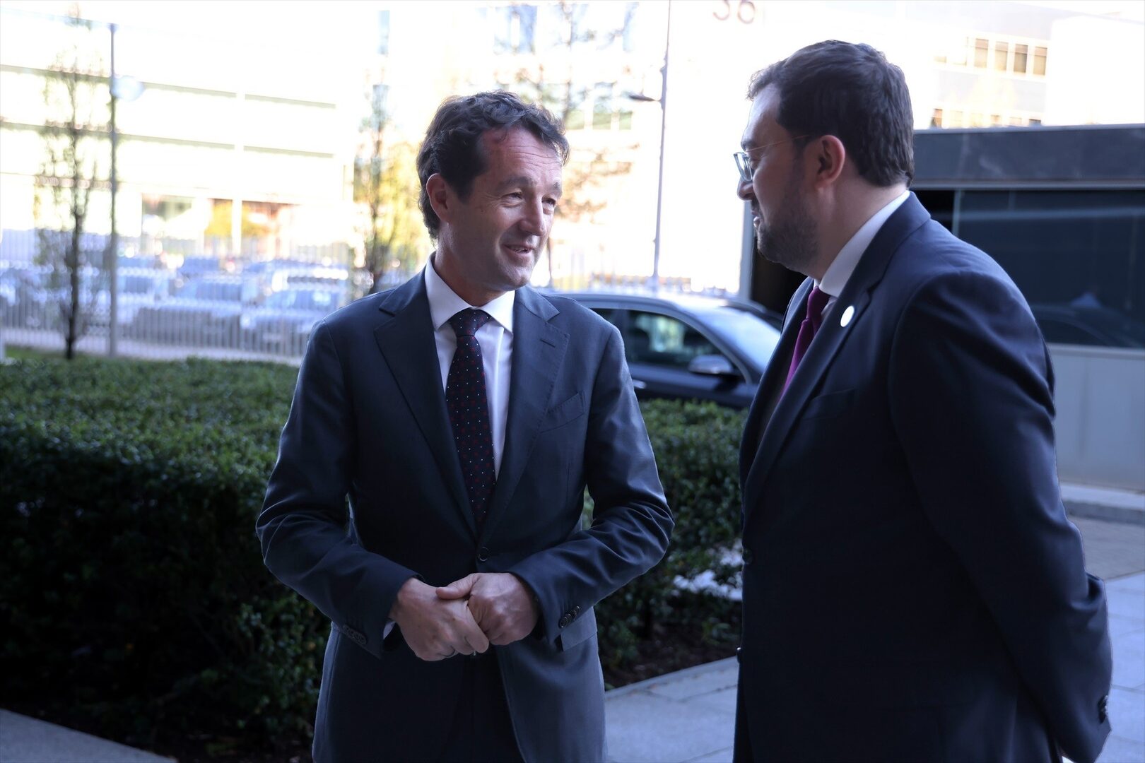 El presidente del Principado de Asturias, Adrián Barbón, se ha reunido este miércoles con el presidente de Indra, Ángel Escribano, en la sede de la compañía en Madrid, un encuentro en el que el mandatario asturiano ha garantizado a la empresa española la "máxima colaboración" de su Ejecutivo para que implante en la región su nueva filial de vehículos militares (Indra Land Vehicles).