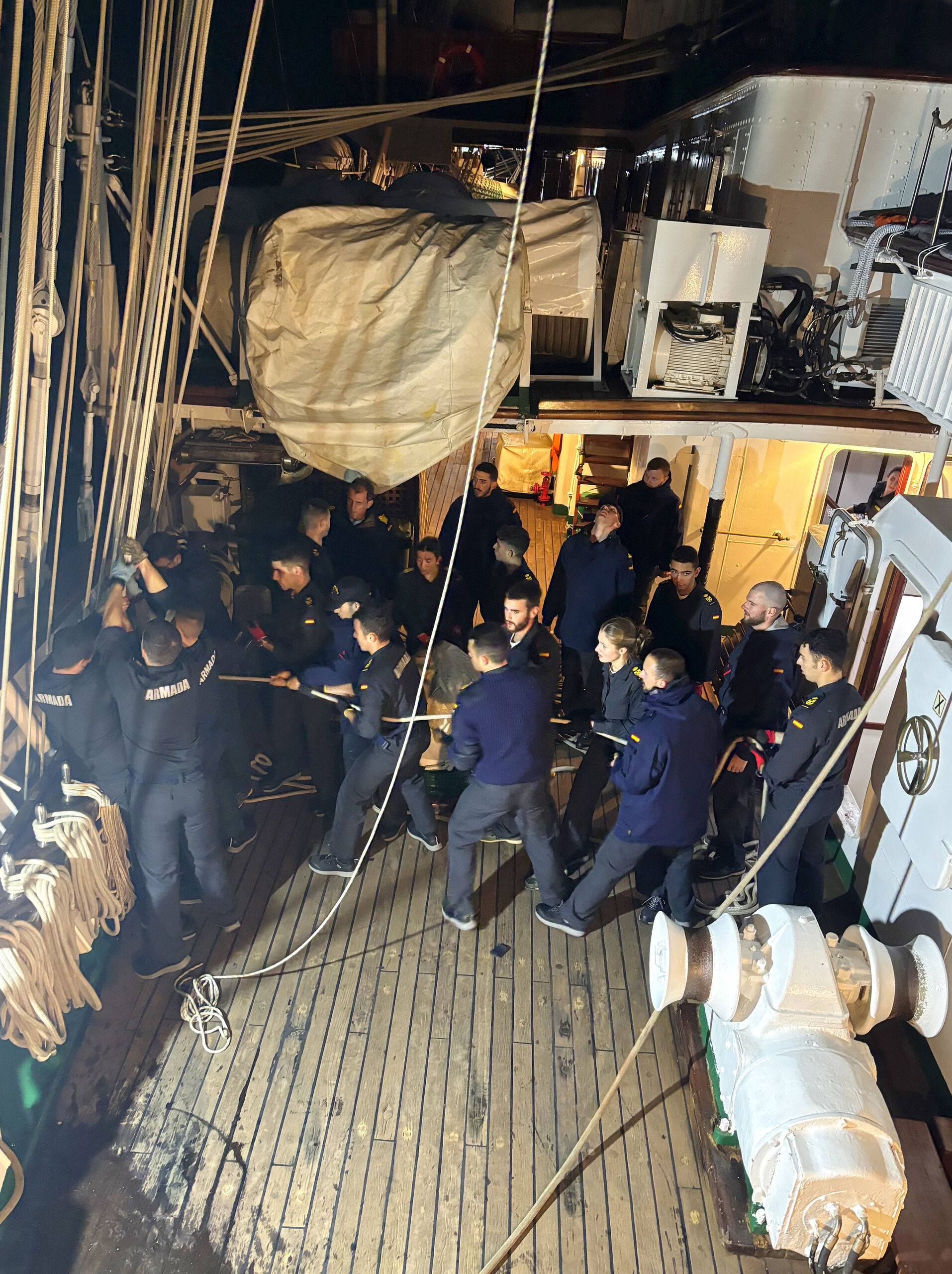 La Princesa Leonor, junto a sus compañeros, realizando una de las arduas actividades a bordo del Elcano.