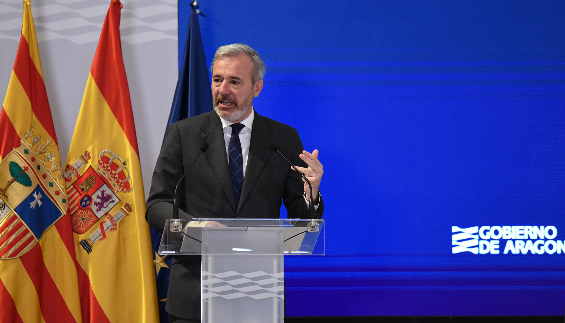 El presidente de Aragón, Jorge Azcón, durante el II Foro Liberdefensa en Zaragoza.