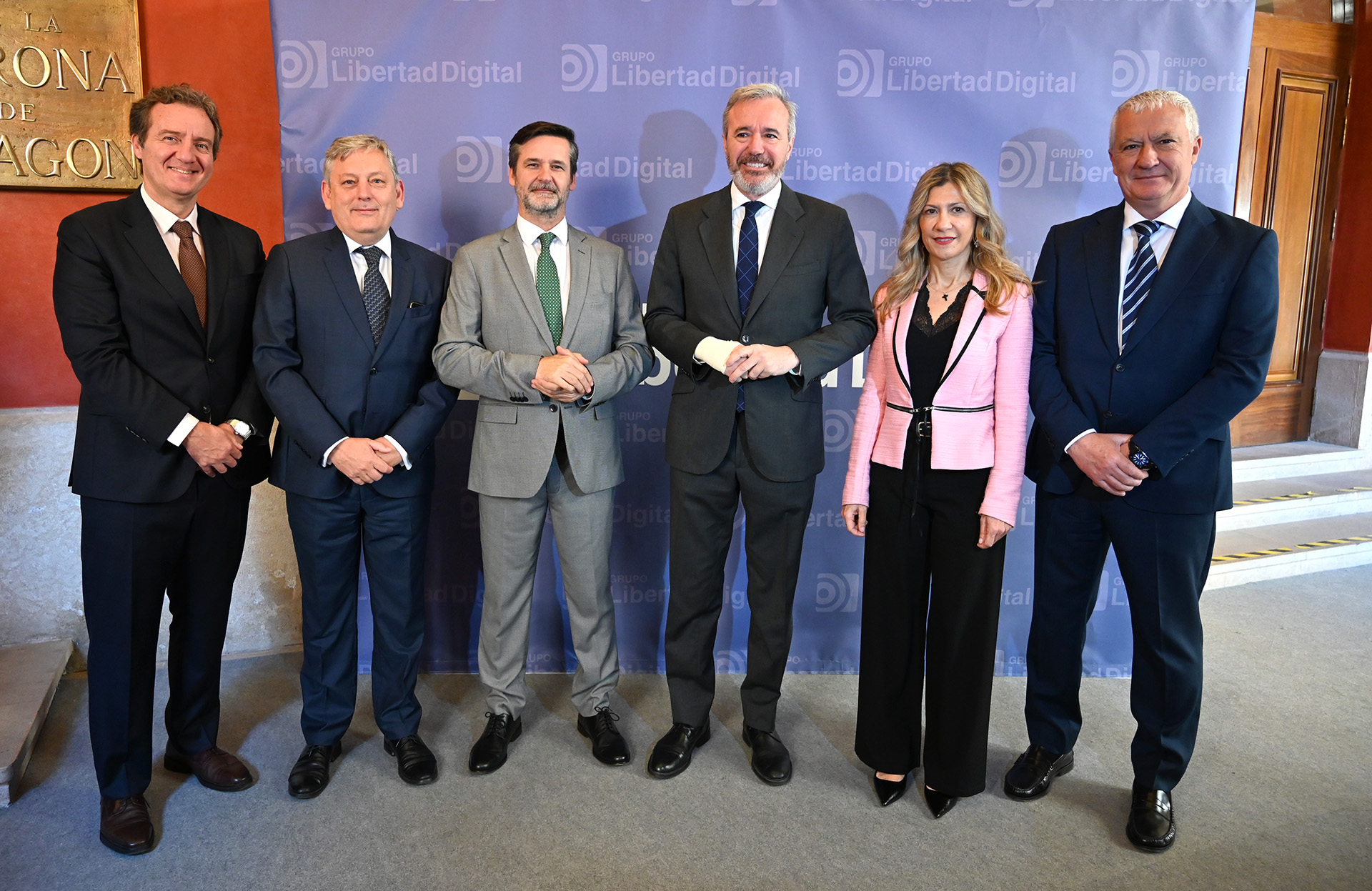 De izquierda a derecha: Juan Plaza, Enrique Navarro, presidente de MQ GlobalNet., Javier Somalo, Director del Grupo Libertad Digital, Jorge Azcón, presidente de Aragón, Mª del Mar Vaquero, Vicepresidenta de Aragón y Luis Rodríguez, Director General del Grupo Libertad Digital.
