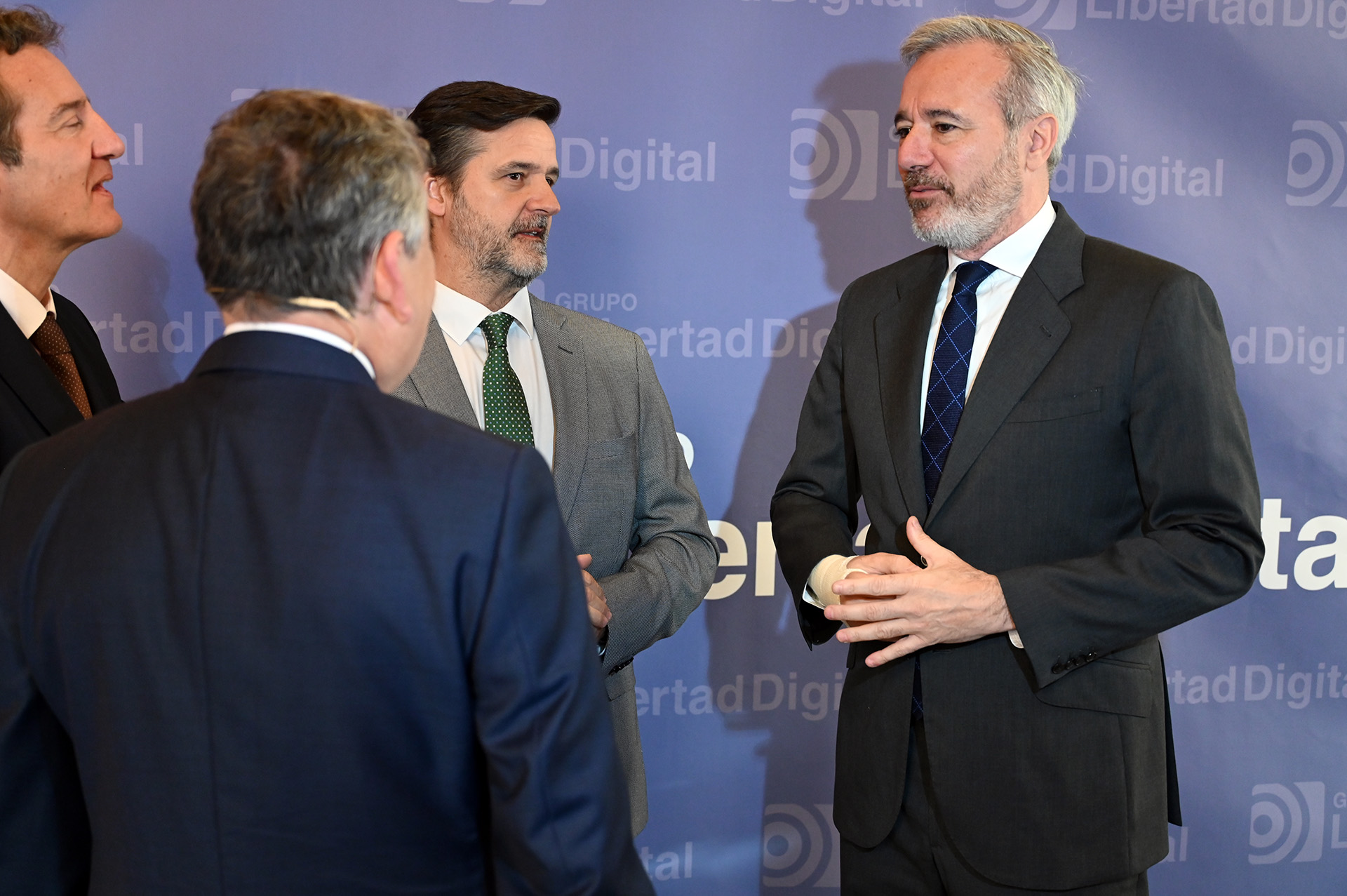 Jorge Azcón, presidente de Aragón, junto a Javier Somalo director del Grupo Libertad Digital, en el II Foro Liberdefensa en Zaragoza.