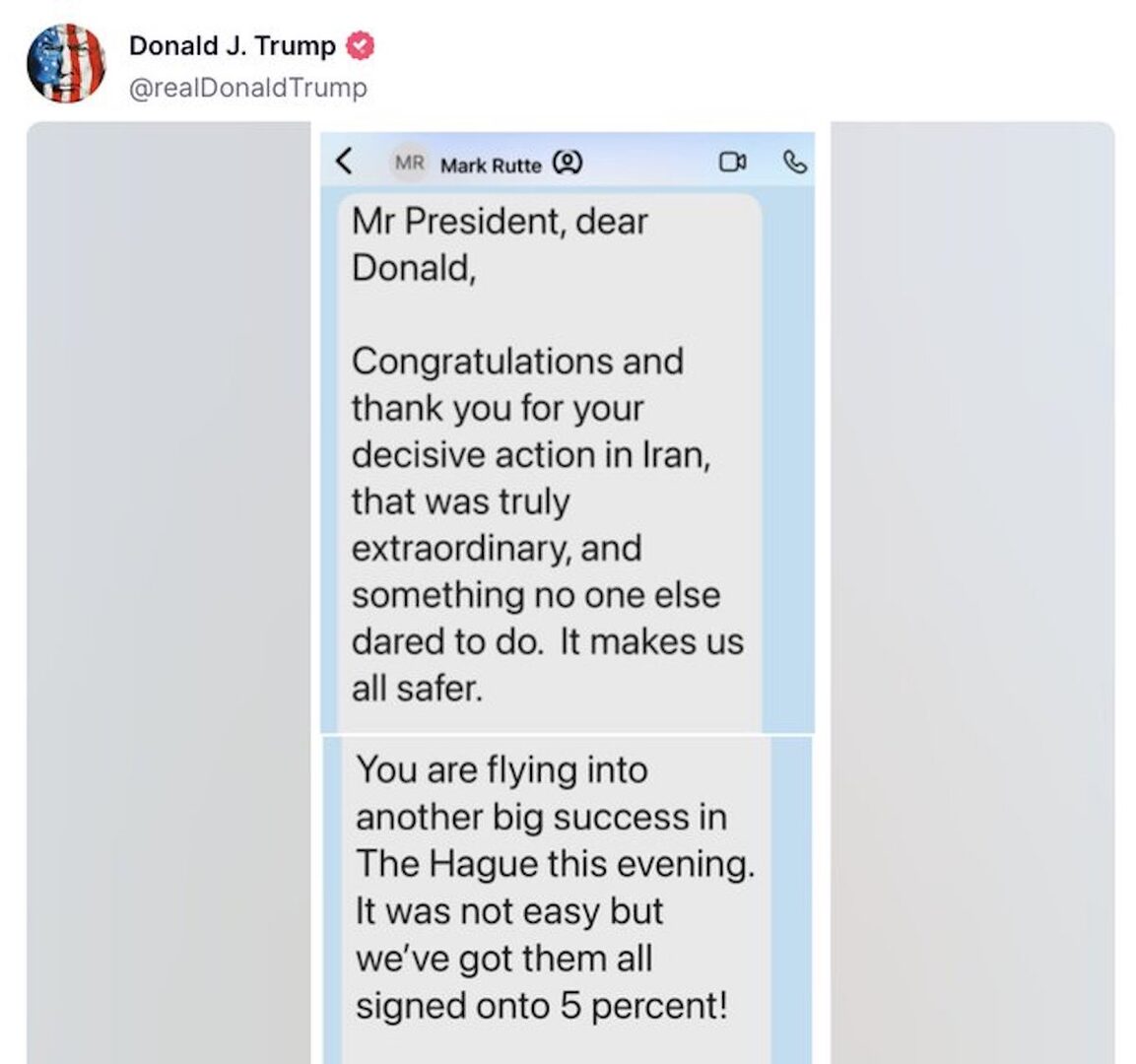 En una muestra más de su peculiar estilo de gobernar, el presidente estadounidense Donald Trump ha difundido en su red social, Truth Social, varias imágenes de mensajes enviados por el secretario general de la OTAN, Mark Rutte, jactándose de que los socios subirán el gasto en defensa en consonancia con los deseos del estadounidense.