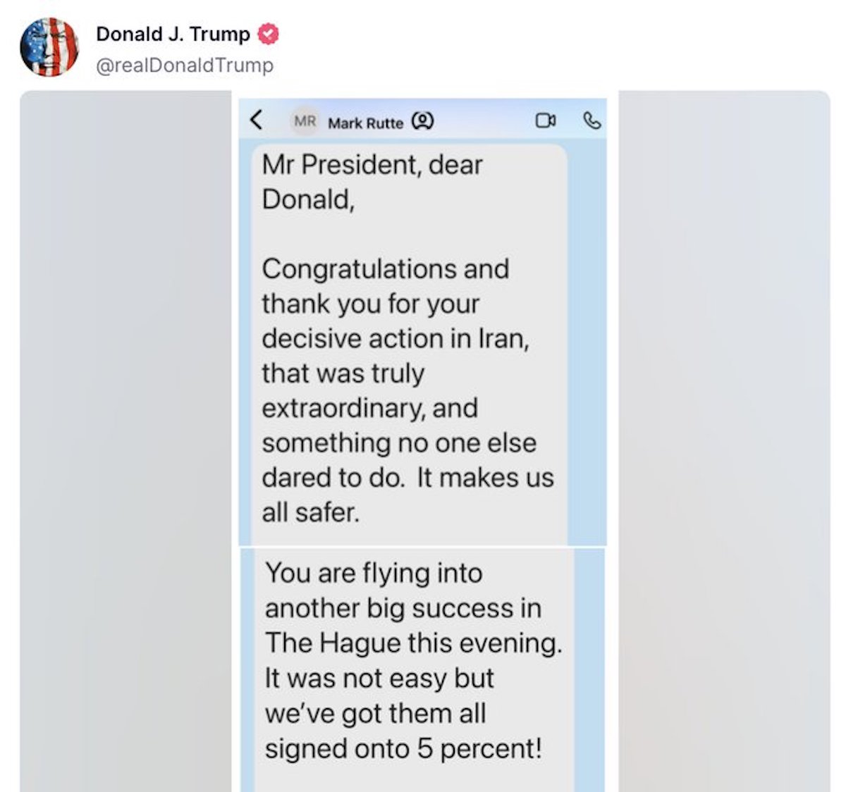En sus mensajes, Rutte le traslada a Trump que la cumbre en Países Bajos será un "gran éxito" y, que "aunque no parecía fácil", "todos" los aliados "firmarán" el compromiso del 5%. Cabe recordar que hace sólo dos días Pedro Sánchez se jactó de lo contrario, declaraciones que fueron luego matizadas en público por el líder de la OTAN.