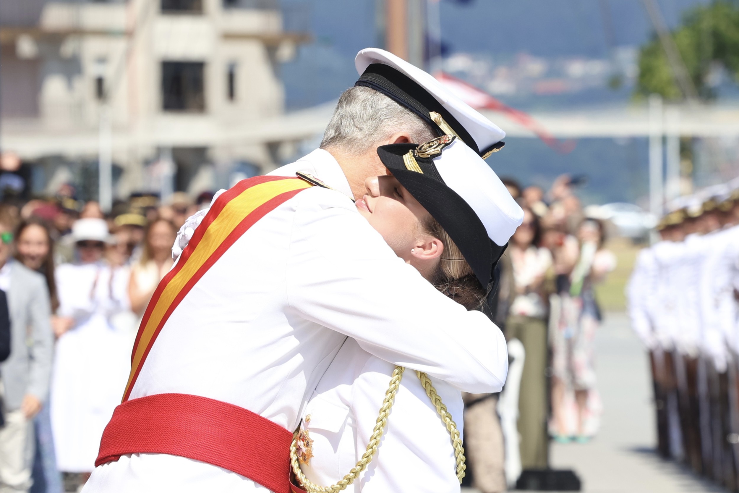 El Rey da un caluroso abrazo a Leonor de Borbón tras imponerle la Gran Cruz al Mérito Naval con distintivo blanco.