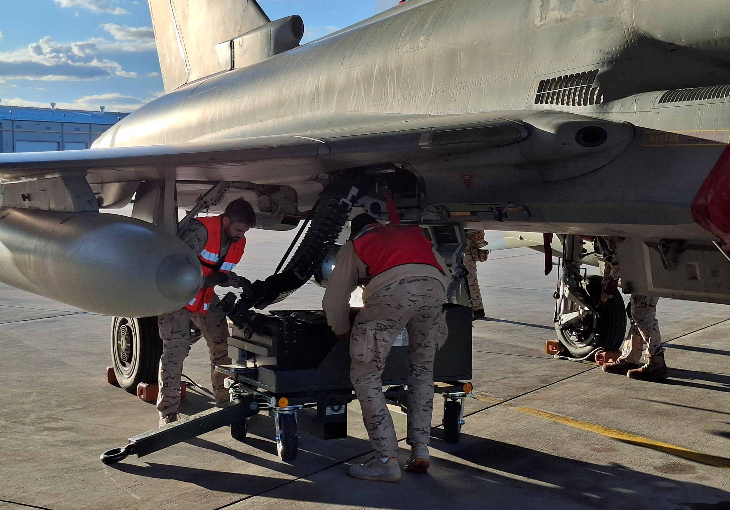 En esta base se encuentran desde el pasado mes de agosto unos 200 militares del Ejército del Aire y Espacio, que conforman el denominado Destacamento Vilkas. Con ocho cazas Eurofighter Typhoon –cuatro en activo y cuatro en reserva–, y un A400M de reabastecimiento en vuelo, este despliegue está conformado por pilotos, mecánicos, armeros, personal médico y de apoyo logístico o económico.