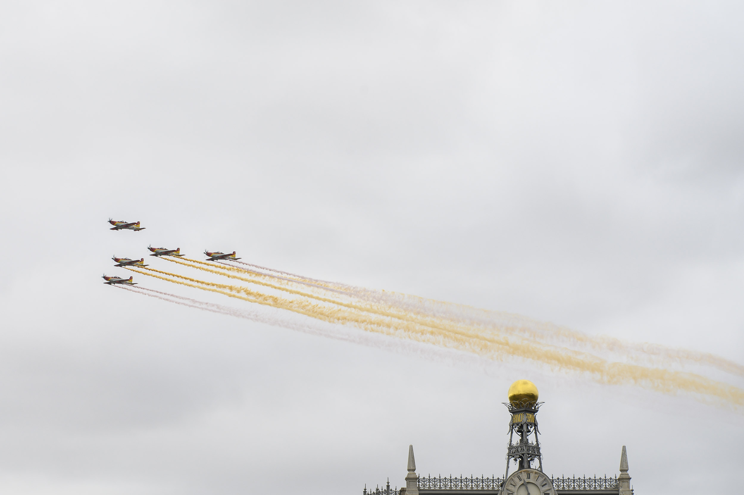 La Formación Mirlo, mientras volaban sobre el Paseo del Prado, en sentido transversal a la vía. Esta patrulla acrobática sustituye a la Patrulla Águila.