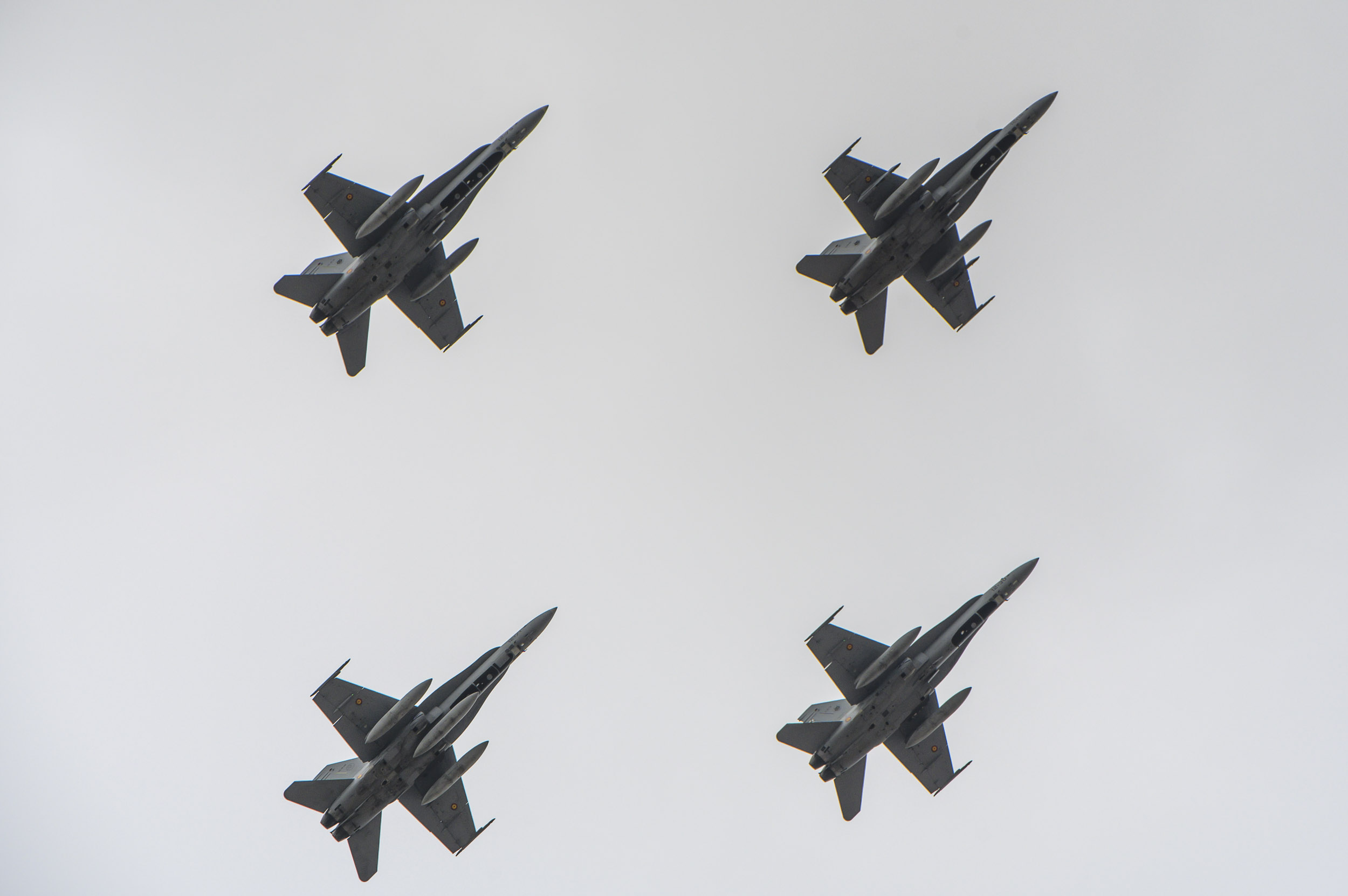 Otra de las formaciones de aeronaves que ha sobrevolado Madrid. Se trata de cazas F18 Hornet del Ejército del Aire y el Espacio.