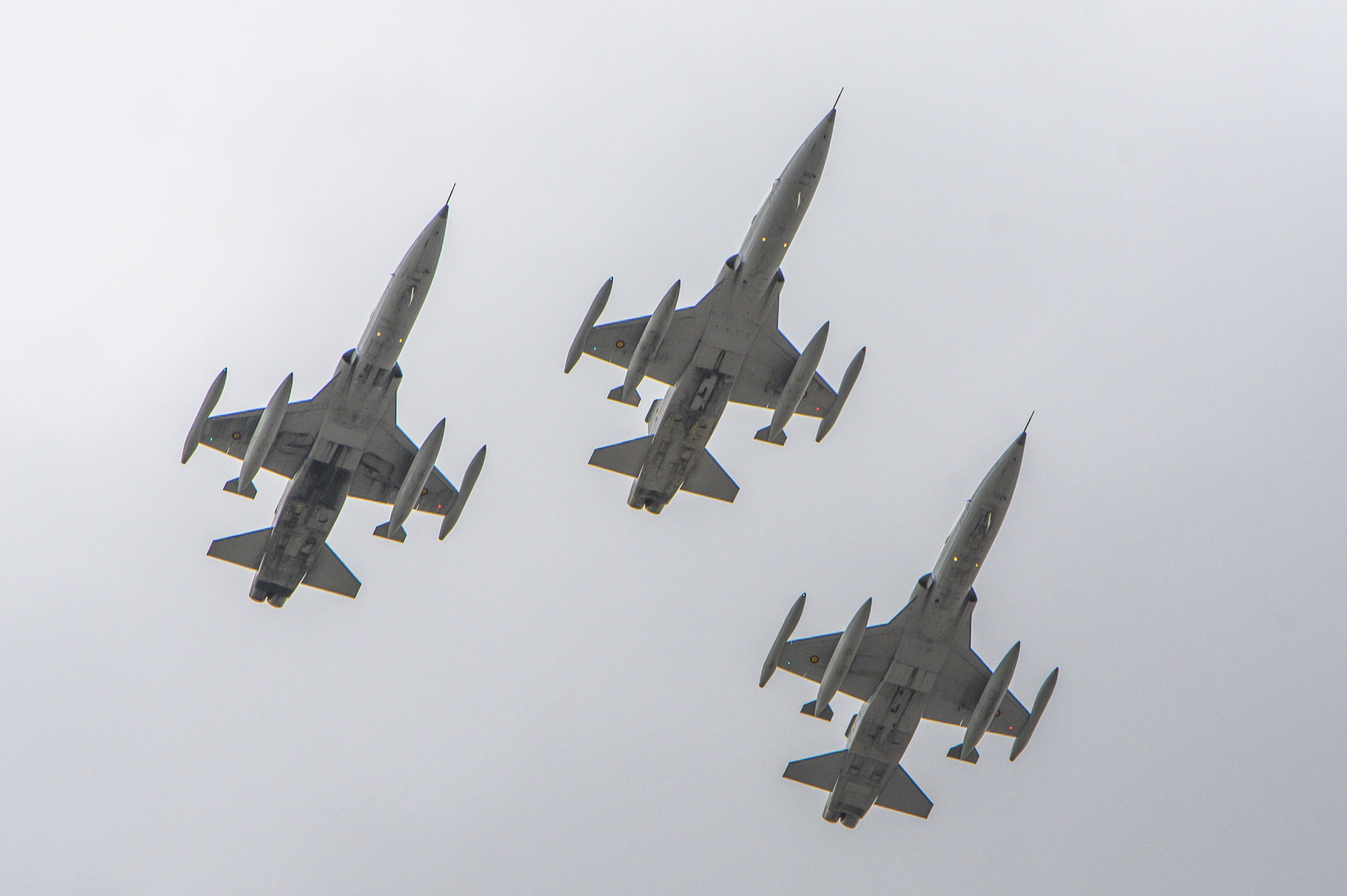 Una formación de tres cazas F5 Northrop. Se emplean en el Ala 23 como adiestradores para los futuros pilotos de los Eurofighter y los F18.