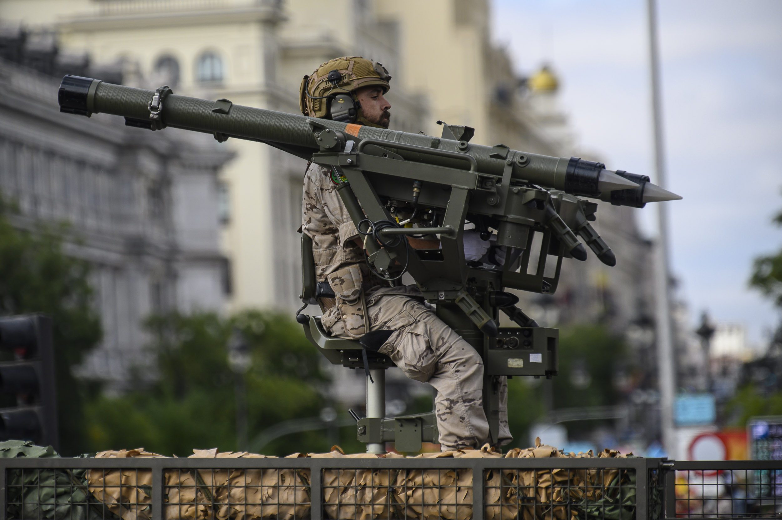 Uno de los soldados sobre un vehículo blindado con un sistema portamisiles Mistral.