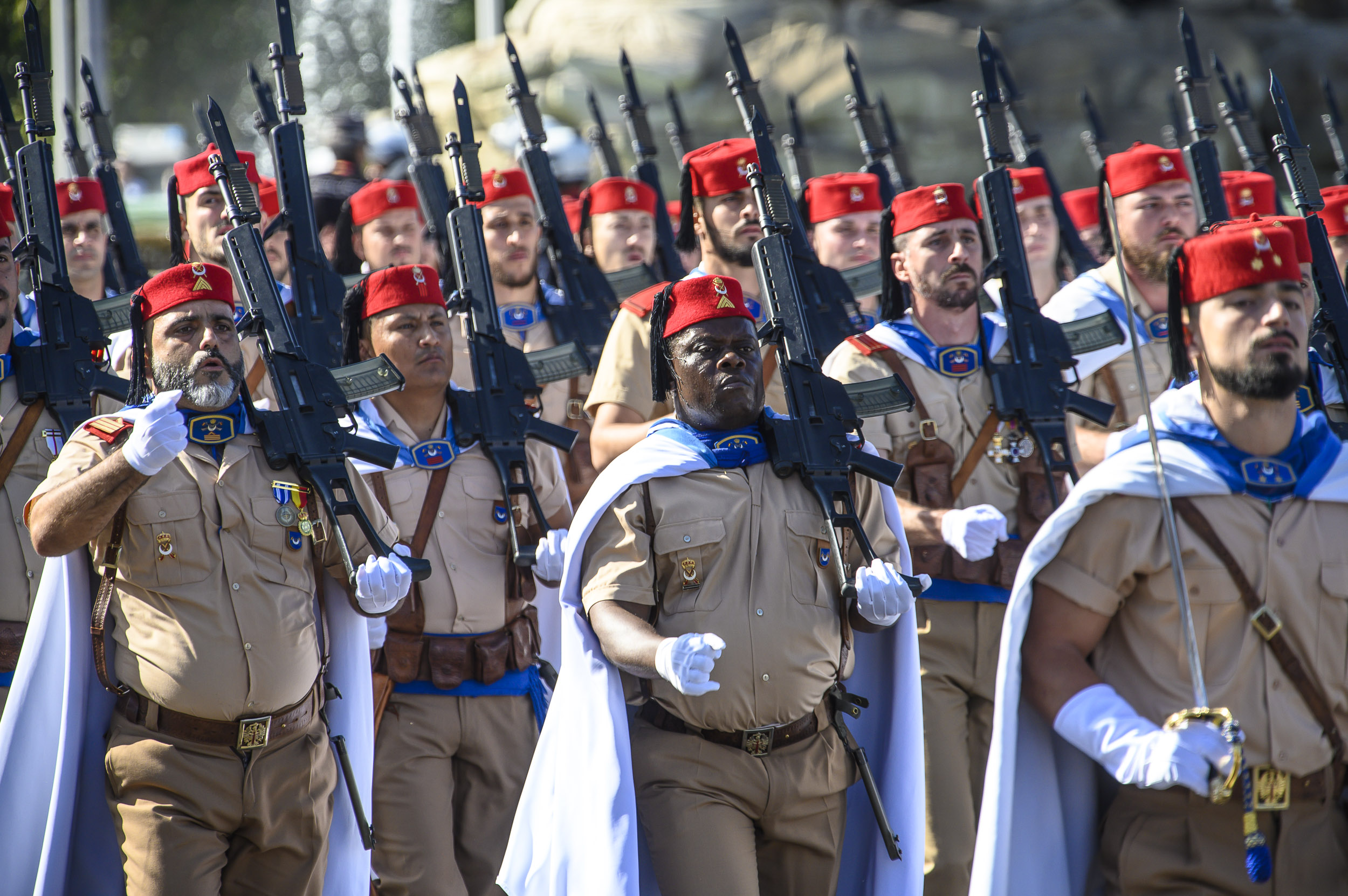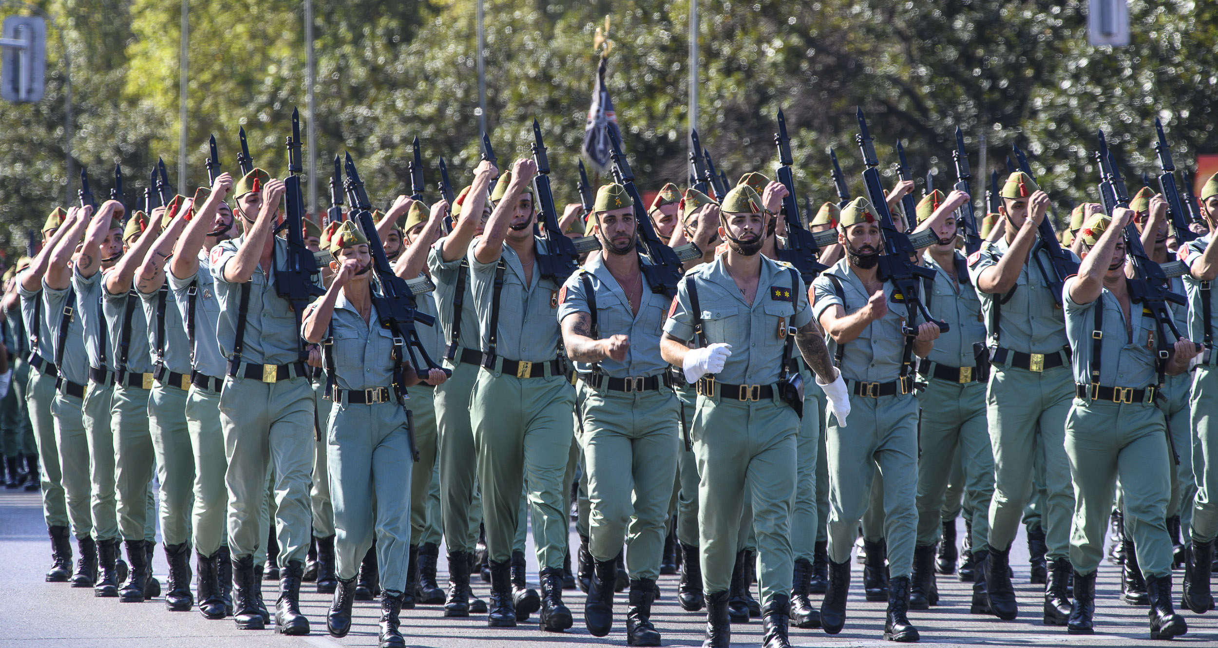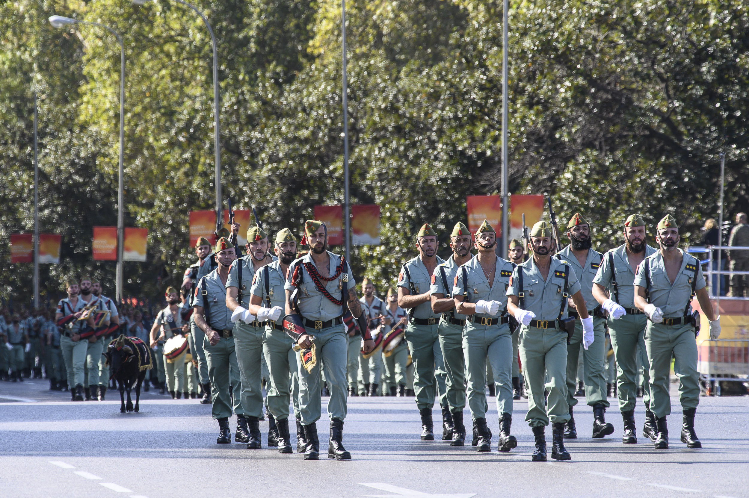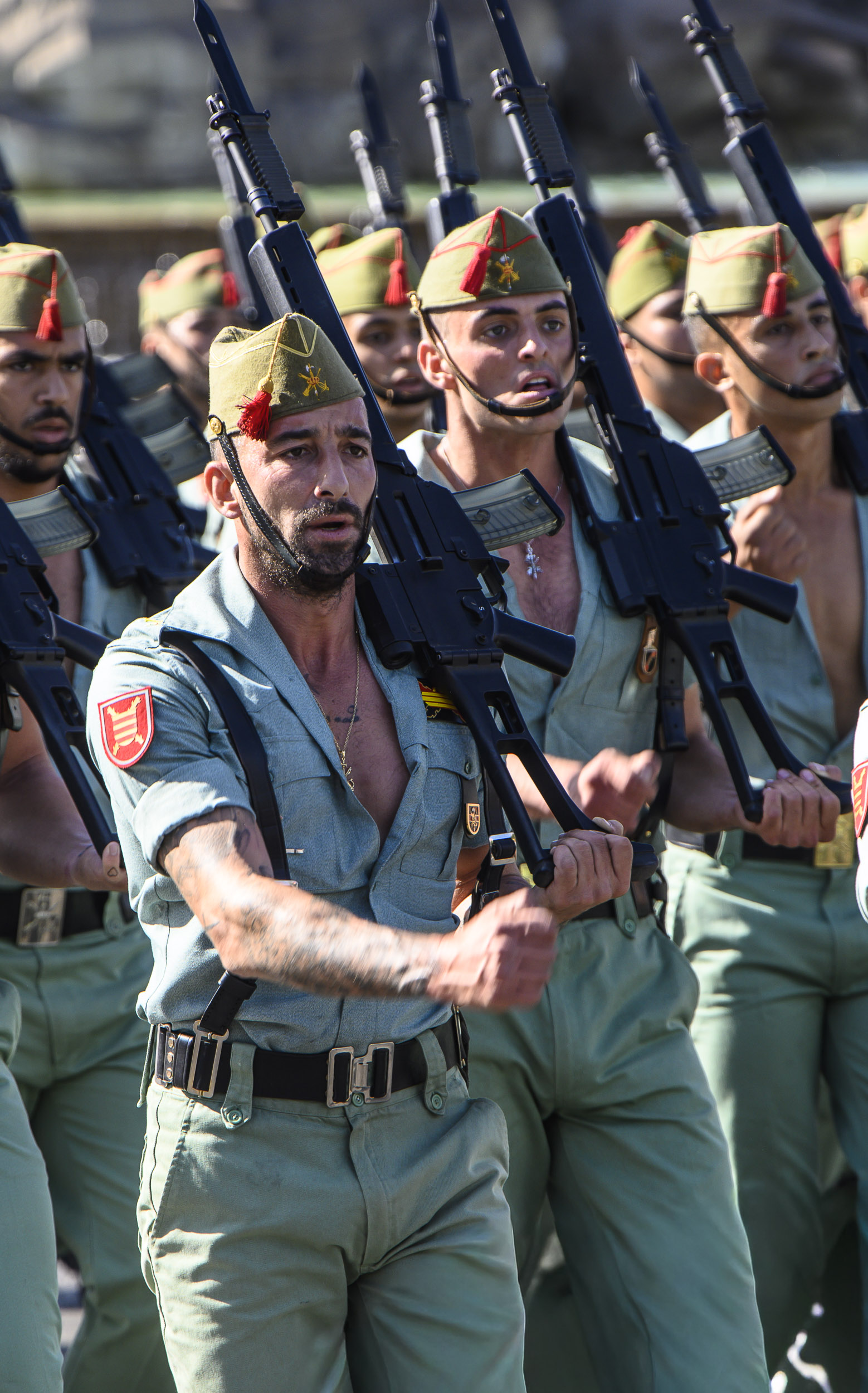 Legionarios durante el desfile, con sus camisas abiertas como manda la tradición.