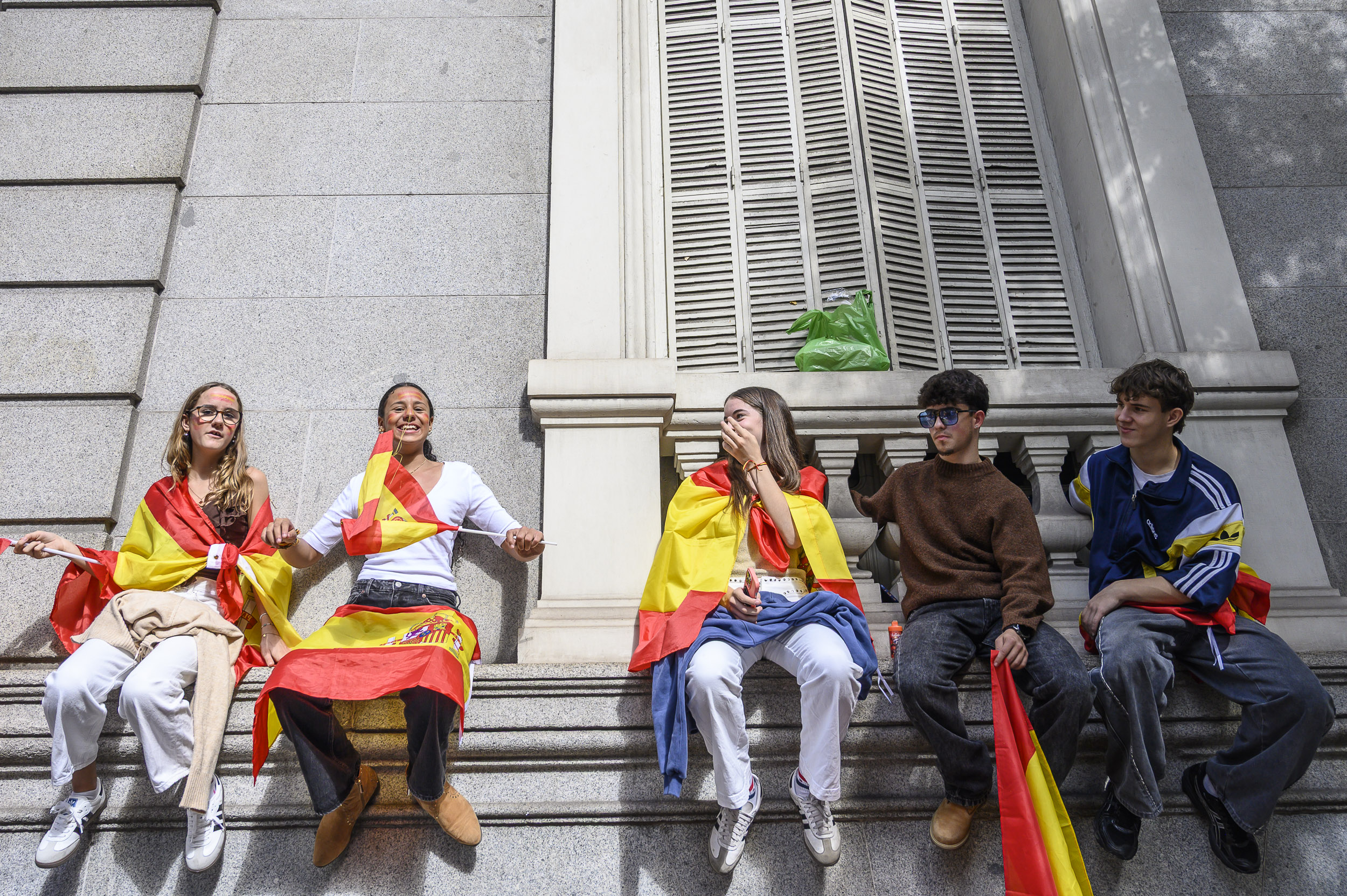 Un grupo de jóvenes viendo el desfile desde la pared de la Casa América.