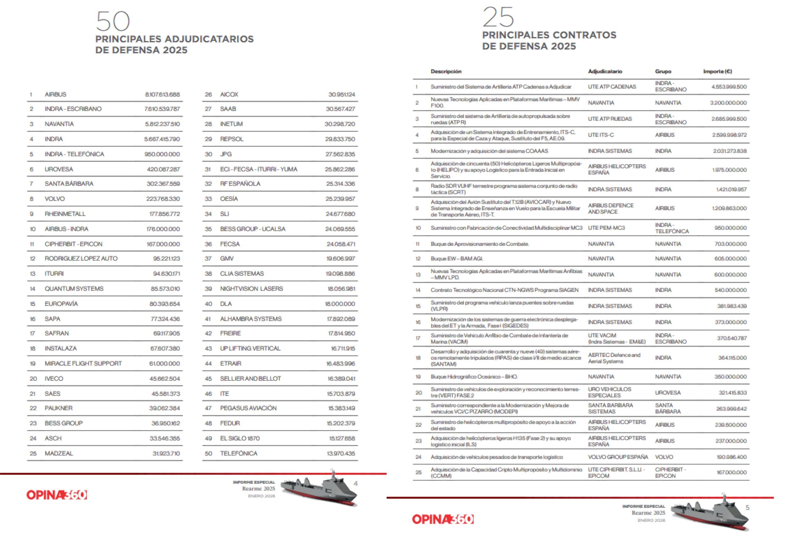 El ranking de los 50 mayores adjudicatarios refleja una fuerte concentración. Airbus encabeza la lista con contratos por valor de 8.108 millones de euros, equivalentes al 25,5% por ciento del total. En segundo lugar figuran las UTE lideradas por Indra y Escribano EM&E, con 7.611 millones de euros, el 23,9 por ciento del importe adjudicado.