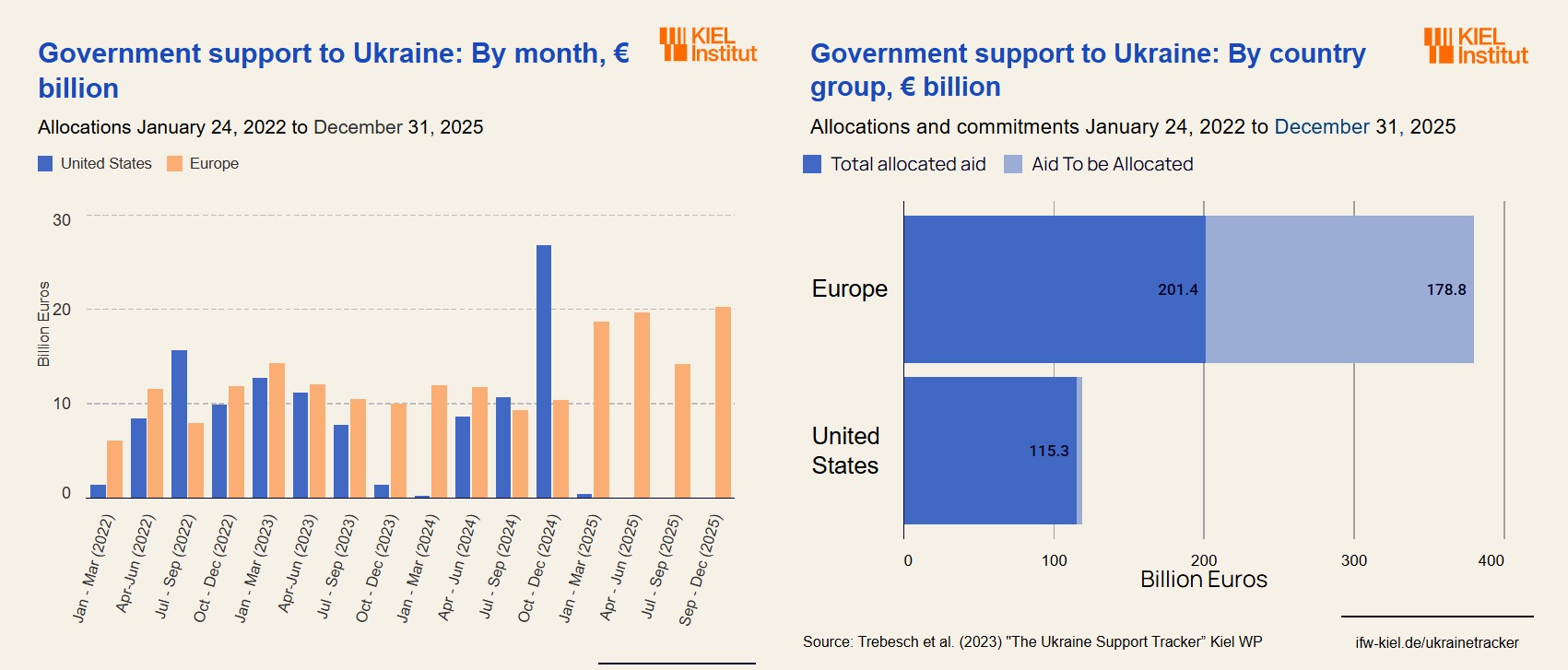 La ayuda prestada o comprometida (militar, económica y humanitaria) por Europa triplica a la de Estados Unidos, cuando en el barómetro anterior tan sólo la duplicaba. La ayuda europea ya enviada (201.400 millones) y la confirmada y pendiente de asignar (178.800 millones) alcanza los 380.200 millones. La de Estados Unidos se ha quedado en 118.950 millones (114.600 asignados y 4.350 pendientes de asignar), la misma cifra desde abril de 2025.