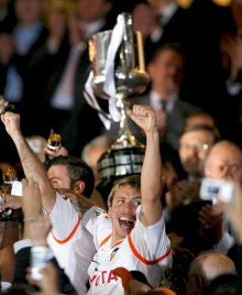 Camps se felicitó por recibir "un trofeo más para la Comunidad Valenciana" y, tras repasar el palmarés del club de Mestalla, destacó la etapa prolífica en títulos de la última década que cierra esta Copa del Rey. "Esta plantilla, este cuerpo técnico y esta directiva forman parte de un ciclo que empezó en 1999. Han sido los nueve años más fructíferos de la historia del Valencia", dijo Camps, que estuvo acompañados por su tres hijos. Agustín Morera, presidente del Valencia, tomó la palabra y recalcó "el sufrimiento y dolor que han vivido los jugadores" durante la temporada y agradeció el "cariño" que la Generalitat presta al Valencia. "Este es un día feliz para el valencianismo porque venimos a ofrecer este éxito al primero de los valencianos y a la institución que representa", dijo Morera.