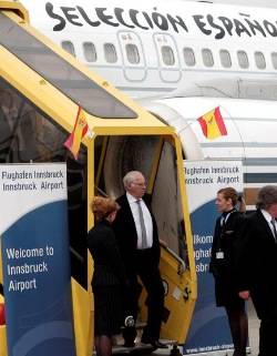 Nada más aterrizar y después de ser agasajados por los mandos locales, jugadores y cuerpo técnico se subieron al autobús que les trasladará por carretera en Austria, en el que se puede leer "pase lo que pase, España siempre". En Neustiff, la localidad donde se hospedará España durante la primera fase, situada a unos 25 kilómetros de Innsbruck, los jugadores fueron homenajeados por un grupo de tiroleses que les dieron la bienvenida interpretando canciones típicas de la zona. Posteriormente se marcharon al hotel Milderer Hof, en el valle de Stubai, para comer y descansar.