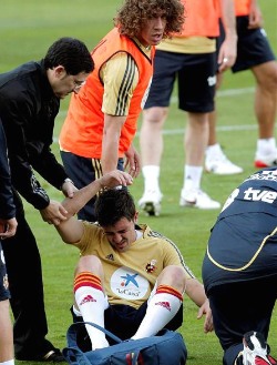 Mientras, Sergio García, repetía el plan de la mañana. Carrera continua y toques suaves de balón. Su recuperación avanza más lenta que la de Villa porque su edema está en una zona más compleja, el sóleo. Sigue siendo duda para jugar ante Rusia.