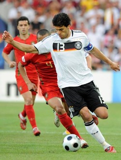 El equipo de Luiz Felipe Scolari, mientras, buscaba su sitio en el campo, a la espera de que algunos de los pases largos de Deco encontrasen destinatario para dar un latigazo al conjunto de Joachim Löw, que estuvo en la grada por sanción. Pero, a pesar de que superado el cuarto de hora, Portugal empezó a liberarse del control alemán, con un Deco entonado en el centro del campo que mandaba bien a los suyos, el partido se decantó a favor del bando alemán a una velocidad de vértigo. Joao Moutinho desaprovechaba una excelente ocasión de gol tras un centro desde la banda de Bosingwa para los lusos y, un minuto después, el que no fallaba era Schweinsteiger en una jugada similar a la portuguesa, en la que convirtió en gol una asistencia de Podolski desde la banda.