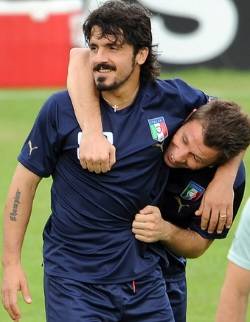 Sobre la selección italiana, Gattuso dice que se trata de "un grupo sólido, con mucho espíritu". "Remamos todos en la misma dirección y la diferencia la marca nuestro grupo", explica 'Rino', duro de roer dentro del terreno de juego, pero que fuera de él afirma que se relaja escuchando música romántica italiana. Gattuso valora el retorno a la selección del ex madridista Antonio Cassano. "Es un jugador increíble, cuyo único problema es su comportamiento, algo de lo que ha conseguido que no se hable ya", explica. "Cuando se siente muy importante es un excelente jugador. Y es bueno para el grupo. Está siempre cantando y gastando bromas", dice.