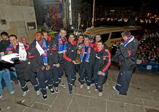 Media hora después de llegar a la plaza, la plantilla se ha montado en el autobús para dar por terminada la celebración. El día después de adjudicarse la Copa del Rey, el Tau ha realizado un entrenamiento vespertino de dos horas.