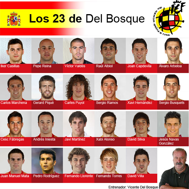 Del Bosque optó finalmente para el terceto de guardametas por el portero menos batido de la temporada, Víctor Valdés, tras un largo debate al respecto, en detrimento de Diego López (Villarreal), el habitual tercero desde su llegada al banquillo, y del joven atlético David de Gea, quien ya tuvo como premio la convocatoria tras su gran temporada.