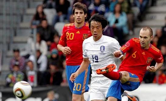 El caso es que la selección española se mostró espesa durante la primera mitad del amistoso jugado en Innsbruck. Falto de ideas y con la carga de trabajo de esta última semana de preparación, el equipo de Vicente del Bosque no pudo desplegar el fútbol que acostumbra. Sólo Cesc Fábregas inquietó la meta de Lee Woon-Jae con un gran disparo que se estrelló en el larguero (m.35). El excesivo orden defensivo de los asiáticos desquició a una España que languideció a medida que avanzaba el encuentro.