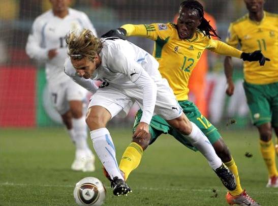 Sudáfrica salió de la caseta revitalizada, más corajuda, quizás tras rememorar en los vestuarios cómo supieron metamorfosearse en el descanso de su debut mundialista frente a México, quizás comprometida con el esfuerzo de la grada, volcada en soplar sus vuvuzelas. Sin embargo, salió también sobreexcitada, a su juego le faltó temple, pausa, y nunca encontró como hacerle daño a la defensa charrúa comandada por Lugano y Godín, muy sólida todo el partido, tal y como lo había estado en su debut frente a Francia.