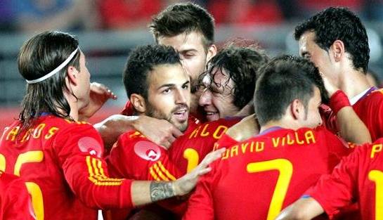 España: Casillas; Sergio Ramos, Puyol, Piqué, Capdevila; Busquets, Xabi Alonso, Xavi; Iniesta, Pedro; y Villa
