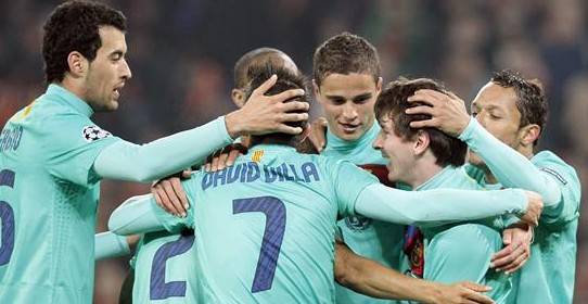 Guardiola únicamente reservó a Pedro e introdujo la novedad de Afellay en un once donde estuvo Leo Messi. El argentino ha vuelto a jugar en el estadio que le vio debutar en Champions y ha anotado su gol número 48 de la temporada, cifra récord para el argentino. Además, hay que destacar el gran partido de Piqué y Mascherano, hoy pareja de centrales y, de nuevo, a Víctor Valdés, el mejor del Barcelona.