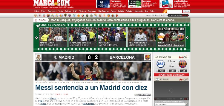 La noticia principal de la portada, firmada por Santiago Siguero, indica que "Messi sentencia a un Madrid con 10" y, tanto en la guía como en la entradilla, escasean los adjetivos calificativos y no hace otra cosa que plasmar datos objetivos. ¿Alabanzas al Madrid? Ninguna. Es más, Marca obvia, directamente, el partido de vuelta en el estadio culé, afirmando que Messi ya "sentencia".
