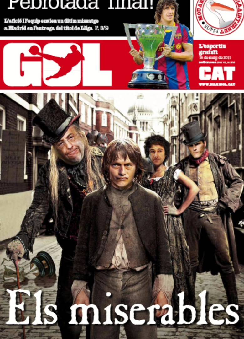 El diario deportivo publicado en catalán Gol no se anda por las ramas a la hora de calificar al Real Madrid. En su portada, titulan en grande "Los Miserables", con un fotomontaje de Florentino Pérez, Jose Mourinho, Aitor Karanka e Iker Casillas. Esto llama la atención, pero lo mejor está en el interior.