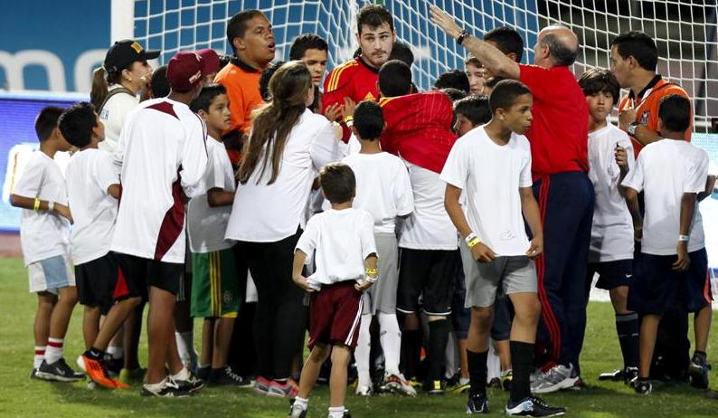 Los guardametas fueron José Manuel Reina e Iker Casillas, mientras que el titular en el partido frente a la Vinotinto, Víctor Valdés, trabajó con los entrenadores de porteros. Al finalizar el entrenamiento, todos los jugadores de la selección española compartieron una sesión de fútbol con niños venezolanos, que incluso se permitieron el lujo de marcarle goles a Casillas y Reina.