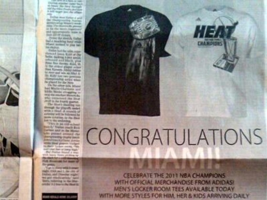 Por lo visto en un anuncio pagado a toda página del periódico local Miami Herald, los campeones de la NBA 2011 son los Heat, a los que se felicita por la victoria y el haber conseguido el título. Como es lógico, se trata de un error humano que dio por garantizado que el equipo de LeBron James, Dwayne Wade, Chris Bosh y compañía iba a ser el campeón, un convencimiento que también tenían la mayoría de vecinos de Miami.