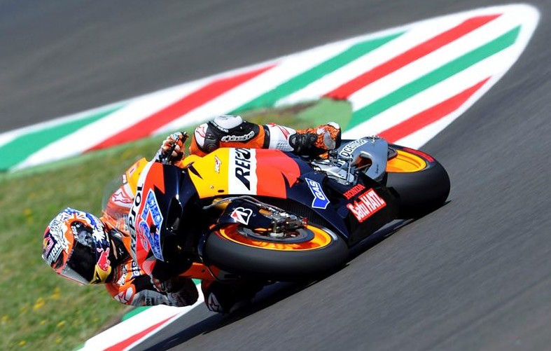 Otro español, Dani Pedrosa (Honda), no pudo superar la octava posición en su primera sesión de calificación en un mes y medio como consecuencia de la caída que sufrió en Francia el 15 de mayo y en la que se fracturó la clavícula. El piloto de Barcelona hizo 1:49.398 en su sexta vuelta de las dieciocho que dio en seco. A 22 minutos para el final, la lluvia arreció y no quedó nadie sobre el trazado italiano. En la clasificación figuraba el orden que luego sería definitivo con Stoner, líder del Mundial de Moto GP, al frente.