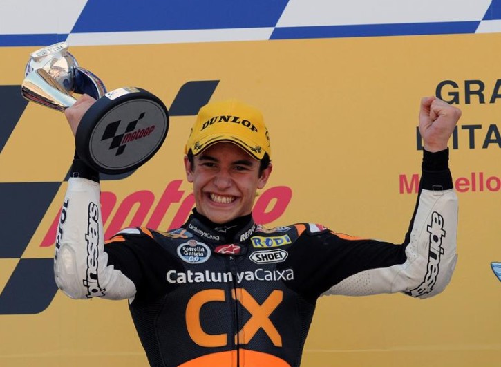 El campeón de 125 c.c. dio también una lección de recursos porque primero estuvo firme en la cabeza y cuando Bradl o el británico Bradley Smith (Tech3) le adelantaron, tuvo la sangre fría de saber esperar su momento y recuperar el primer puesto. A pesar de que Bradl hizo la vuelta rápida en la última, con 1:53.362, el español supo tapar todas las puertas y cruzó primero la meta. Smith lo hizo en la tercera plaza, De Angelis en la cuarta, e Iannone, que había quedado descolgado, en la quinta.