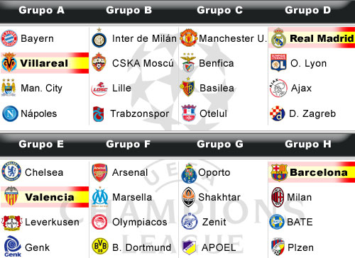 El Villarreal ha sido el equipo español peor parado en el sorteo de la fase de grupos de la Champions. El submarino ha quedado encuadrado en el grupo de la muerte. Mucha más suerte han tenido el Barcelona y el Real Madrid que deberían pasar de ronda sin demasiados problemas. El Valencia volverá a ver a Mata en Mestalla y ha quedado encuadrado en un grupo asequible.