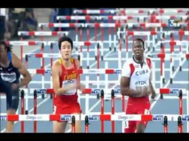 El atleta cubano Dayron Robles obstaculiza a su contrincante chino.