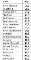 En lo que respecta a la Bundesliga alemana, se trata de la competición con menos diferencia entre el primero y el último, tan sólo 14,8 millones, si bien hay que añadir que los ingresos por televisión son casi de la mitad que en España. Llama la atención que la diferencia entre un equipo y el siguiente es de algo menos de un millón, de una forma perfectamente escalonada.
