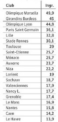 iferencias también son mucho más reducidas que en España, aunque algo mayores que en Inglaterra. Así, el que más cobró en la temporada pasada fue el Olympique de Marsella con 50 millones, cinco millones más que el segundo y el tercero, Girondins y Olympique de Lyon, y 36 millones más que el Le Havre, el más pobre con 14 millones.